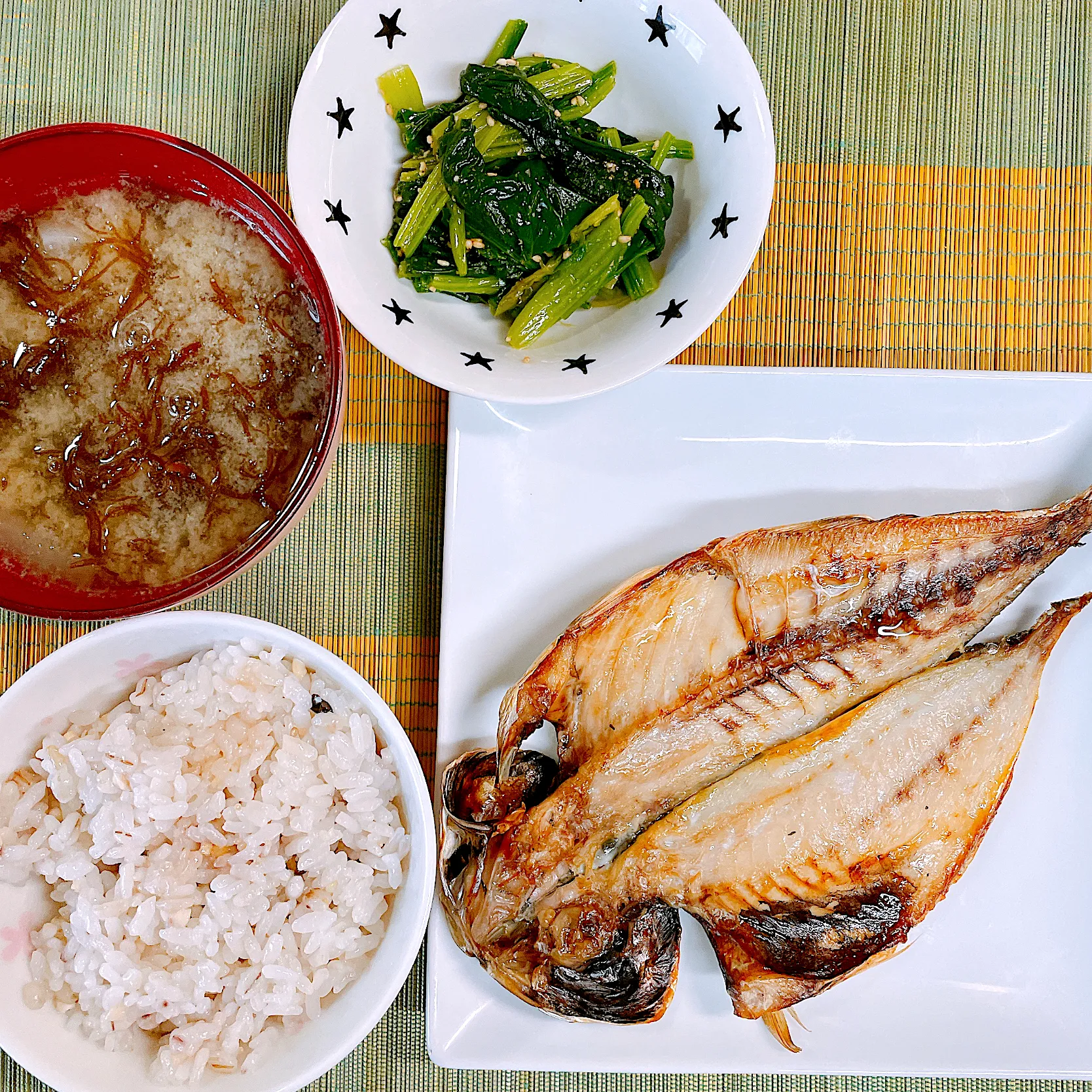あじの干物♡ほうれん草のごまあえ♡お味噌汁♡