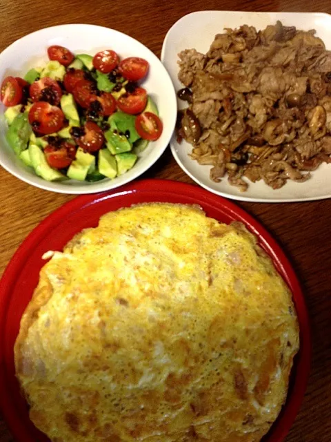 ★シーチキンたまご★豚とキノコの炒めもん★いつものアボカド