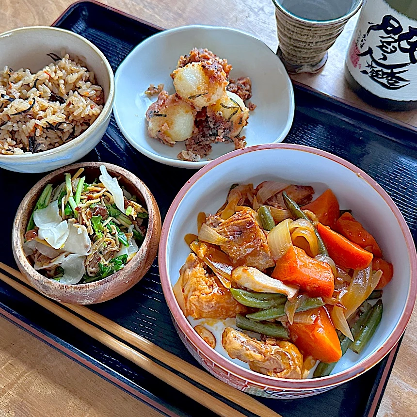 酢豚、カブと山茶茸のサラダ、タラモサラダ、ジューシー