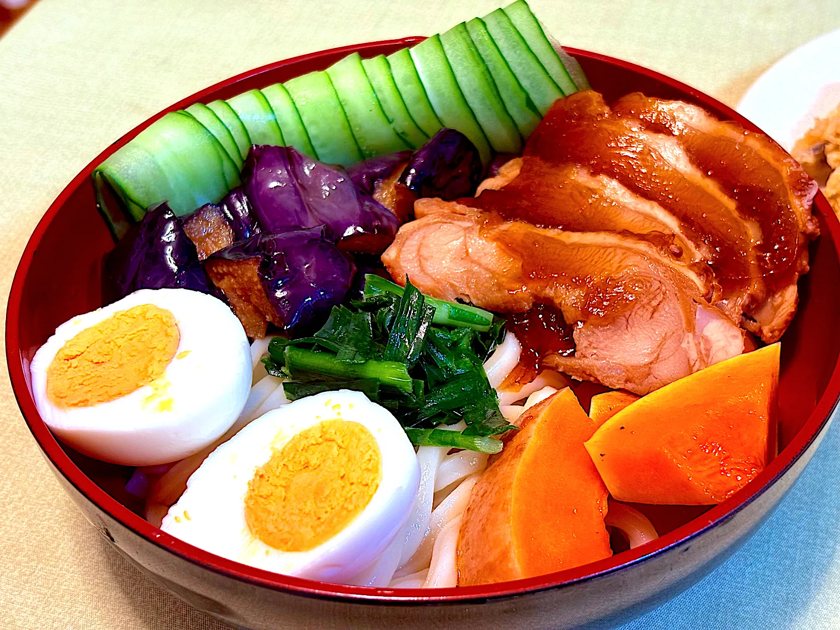 茄子の揚げ浸しと蒸し南瓜のうどん 鶏焼豚&茹で卵トッピング