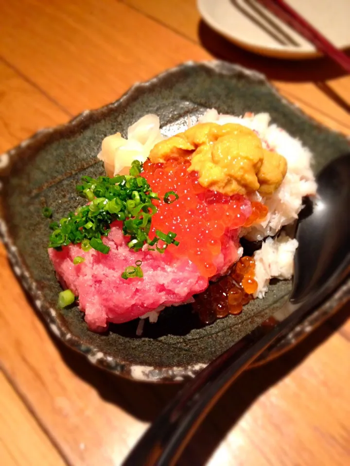 かっぱ巻きの上にどどーんとマグロとカニとウニ。