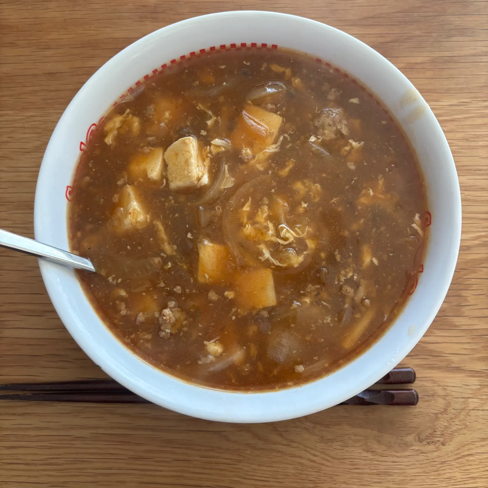 無印の辛い麺。昨日の麻婆豆腐がちょっと残ってるからアレンジバージョン🤗