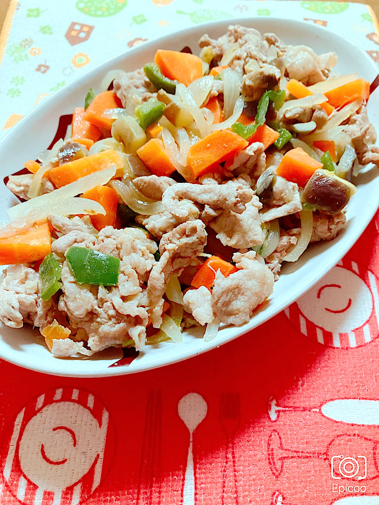 豚肉、玉葱、人参、ピーマンをよく炒め塩胡椒してお皿に盛り付けたら出来上がり😀味付けは好みてマヨネーズかけてもドレッシンかけても本つゆかけてもどれも美味しいです😍😍
