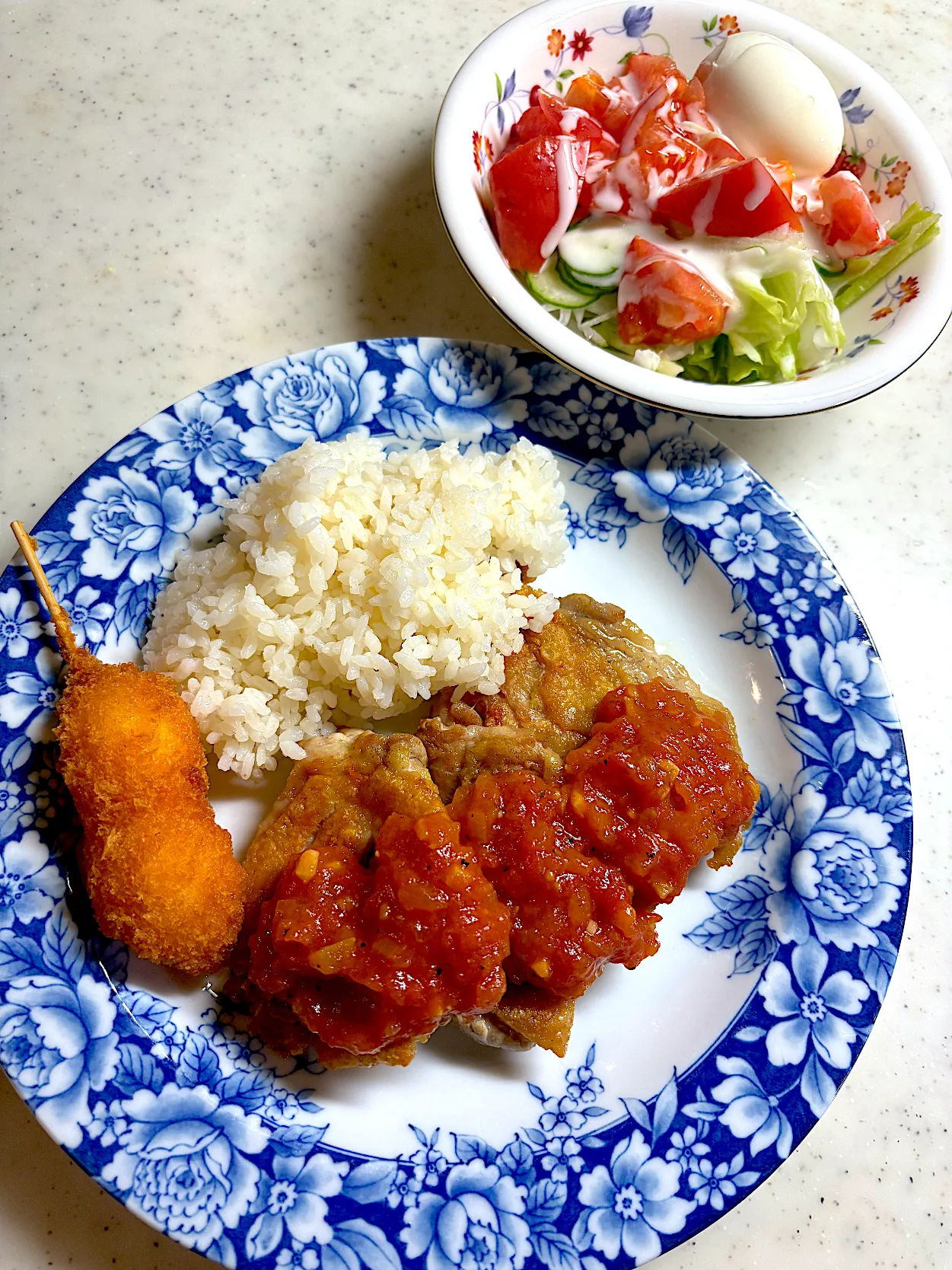 お夕飯 鰹のたたき・カボチャサラダ・厚揚げお好み焼き...