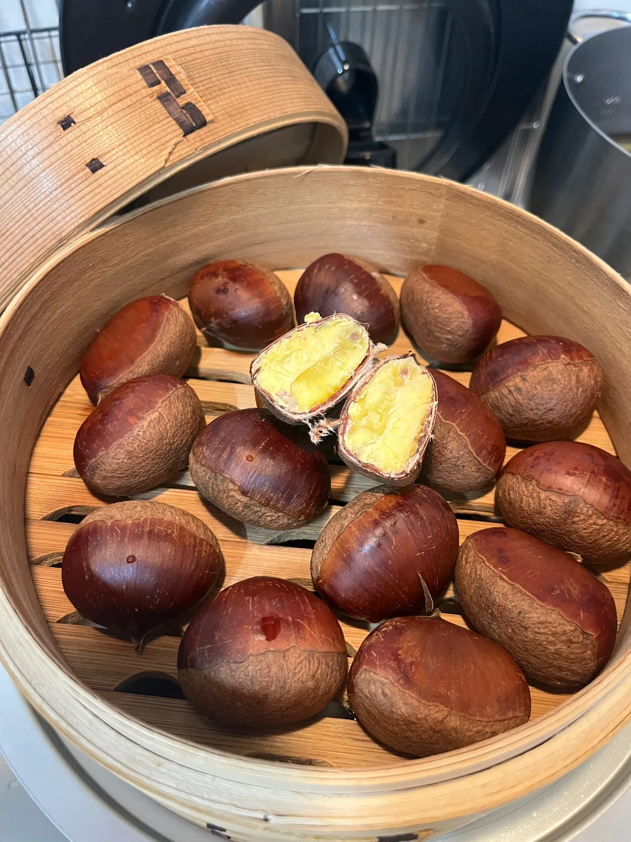 栗ご飯用にくりむきを始めて、途中でちょっと手が疲れたな〜という事で残りを蒸篭で蒸しました😊
