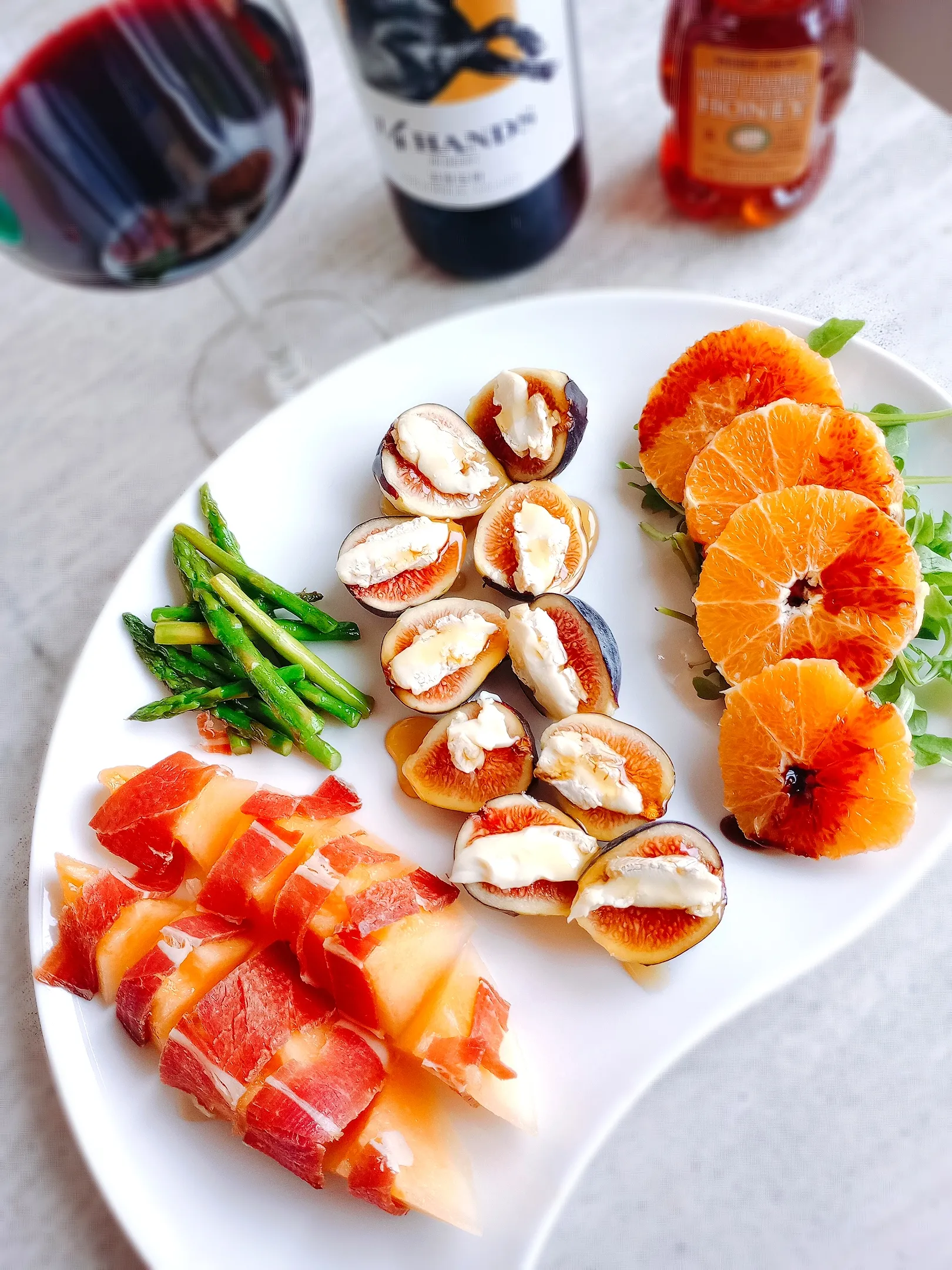 2024.09.14#ワインのお供 #おつまみプレート #フルーツ #イチジク #ブリーチーズ #メロン #生ハム #生ハムメロン #ネーブルオレンジ #ルッコラ #アスパラガス