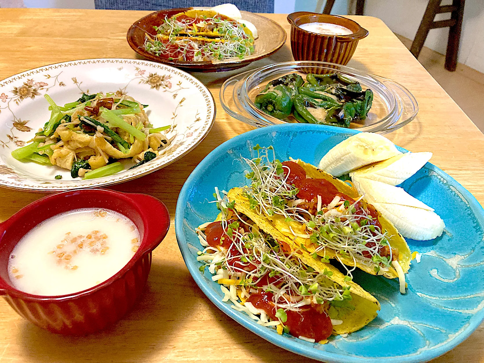 玉ねぎみそクリームスープ、バナナ、タコス🌮、小松菜とエノキと油揚げのペペロンチーノ。