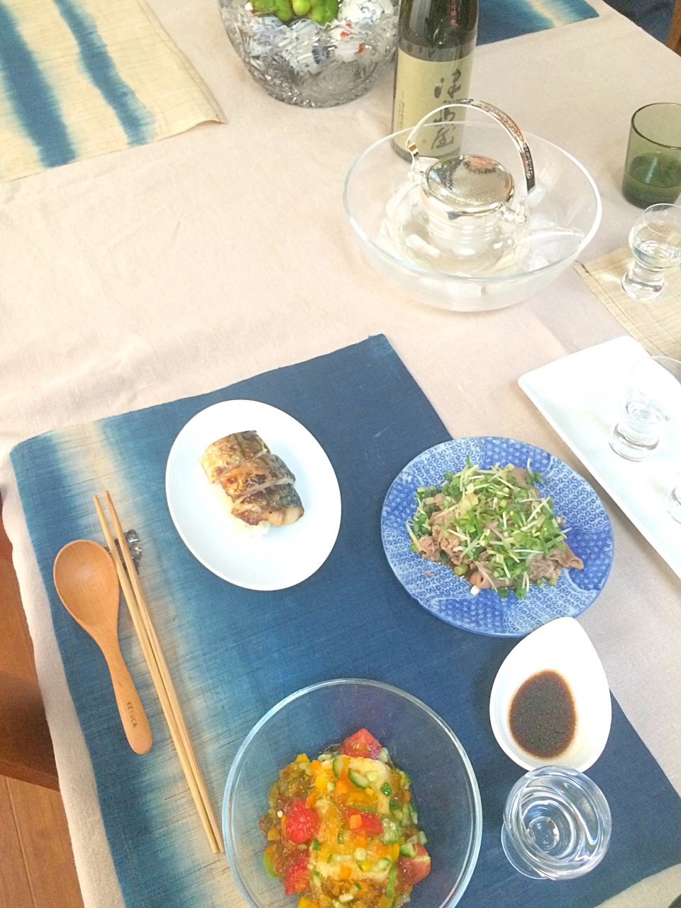 2017.7 お料理サロン 夏を乗り切る和食 🌻変わり冷や奴(オクラ、フルーツトマト、胡瓜、茄子、パプリカ等のお出汁ジュレ) 🌻冷しゃぶ、万能薬味添え(茗荷、ネギ、貝割れ、生姜、大葉) 🌻焼き鯖の棒鮨(生姜の甘酢漬け、白いりごま)