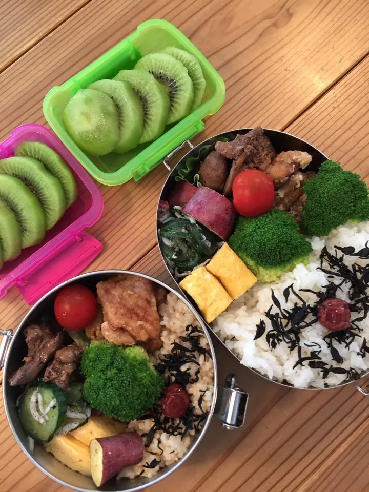 鯖竜田揚げ 玉子焼き 鶏肝しぐれ煮 キュウリとシラスのナムル サツマイモ ブロッコリー ミニトマト キウイ