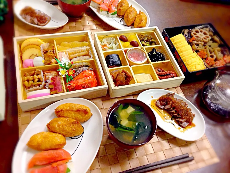 夜は手作りお寿司🍣稲荷とサーモン押し寿司にしました。お吸い物とローストビーフとおせちの残りと☻
