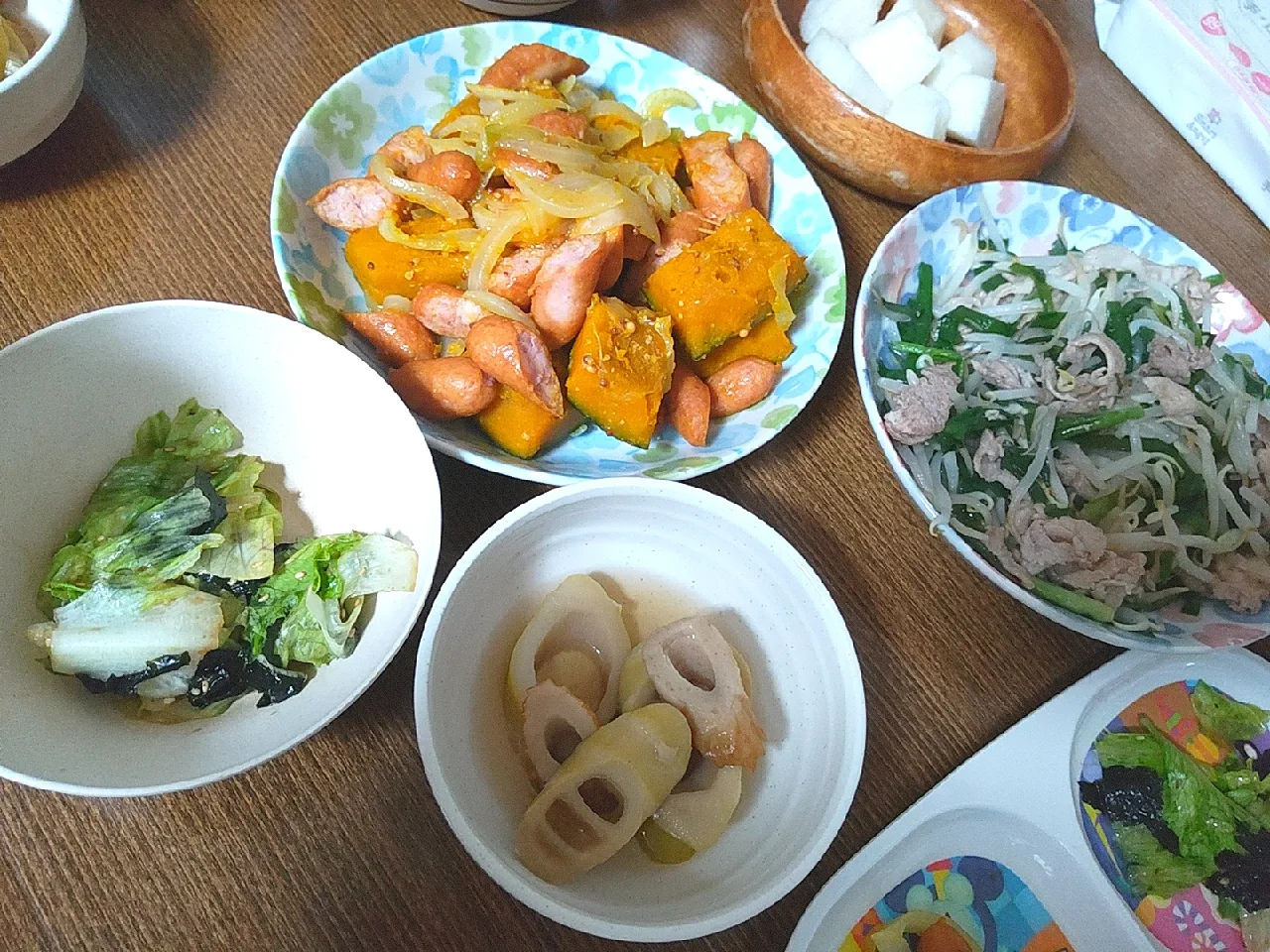 ジャーマンパンプキン ニラ豚 四方竹とちくわの煮物 チョレギサラダ