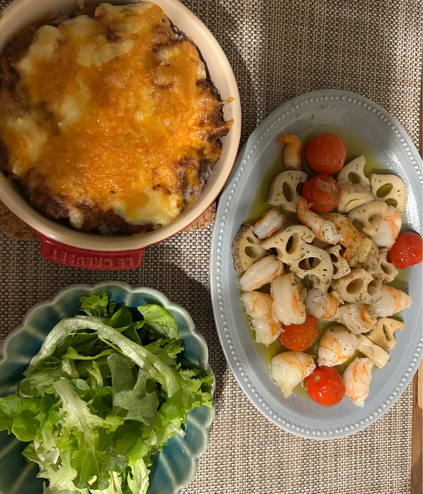 ミートソースドリア、海老と野菜のアヒージョ風炒め、グリーンサラダ