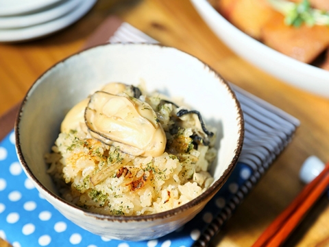 緑茶の香りがふわっと香る炊き込みごはん。抗酸化作用のある牡蛎、緑茶、生姜、ごぼうを使ったヘルシーな一品です。牡蛎はごはんと一緒に炊くと縮むので、あらかじめ味をつけながら火を通しておき、仕上げに加えるようにます。煮汁もごはんを炊く際に使用するので、全体に牡蛎の旨味が広がります。しょうがも、仕上げに加えて香りを楽しみます。粉茶は、緑茶の茶葉を粉末状にしたものですが、なければ緑茶をミルなどで細かく撹拌して使用します。