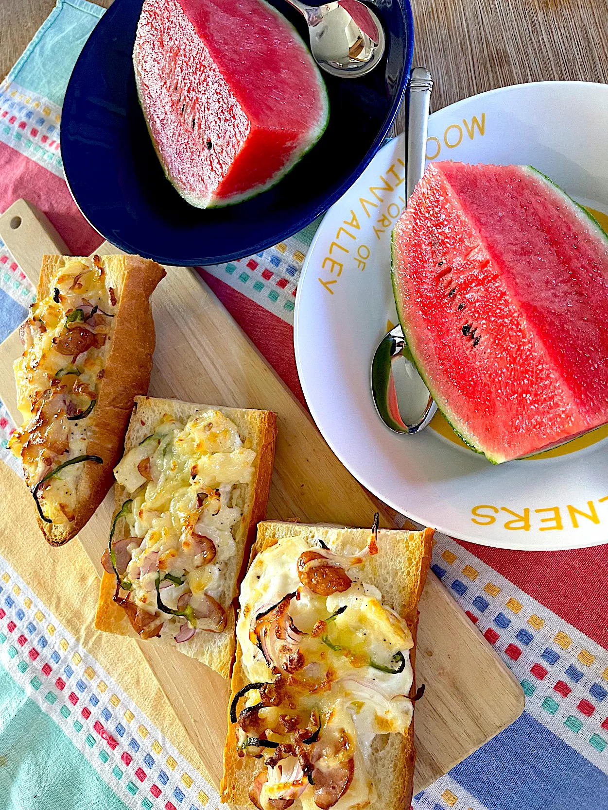 #有機じゃがいも、ピーマン、紫玉ねぎ、すいか