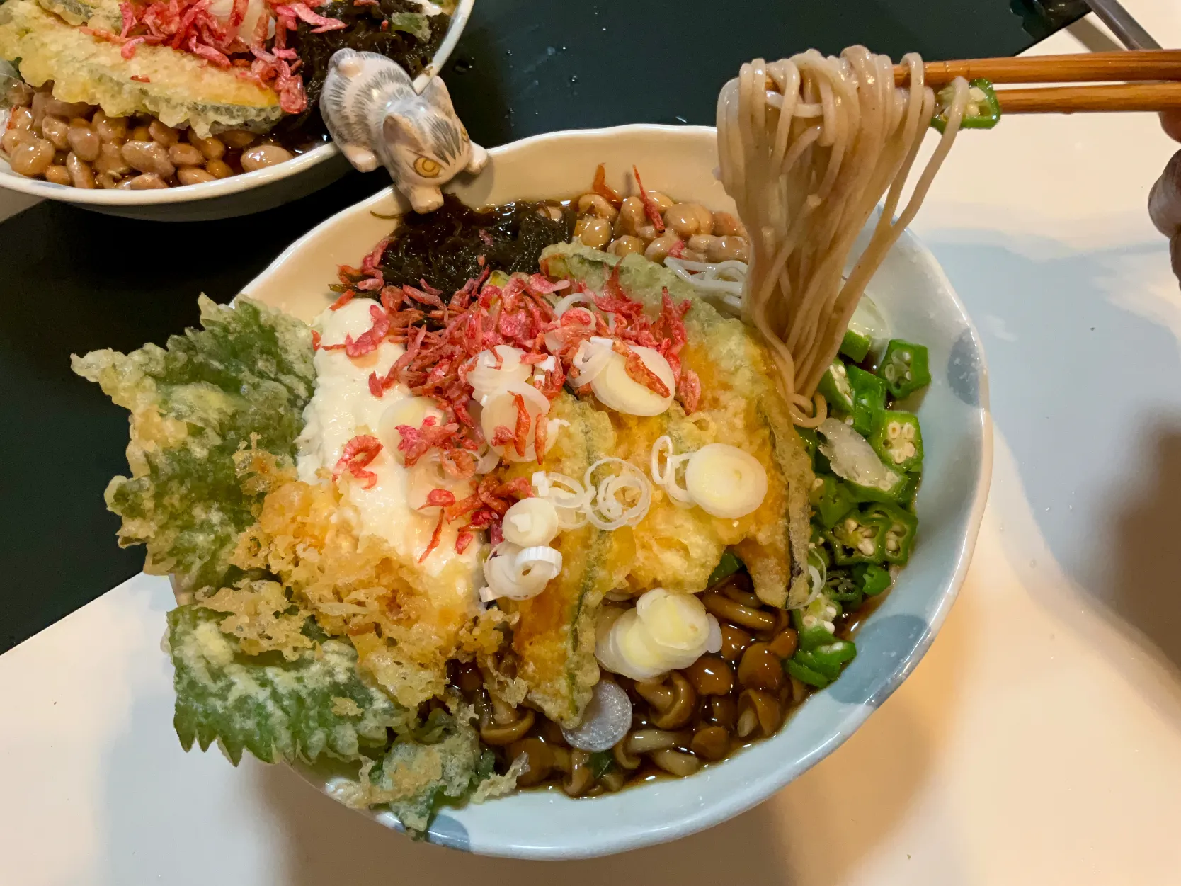 オクラ、納豆、めかぶ、大和芋、ナメコでネバネバ大会! 今日は、かぼちゃと紫蘇の天ぷらに干しエビ付きの冷たいお蕎麦