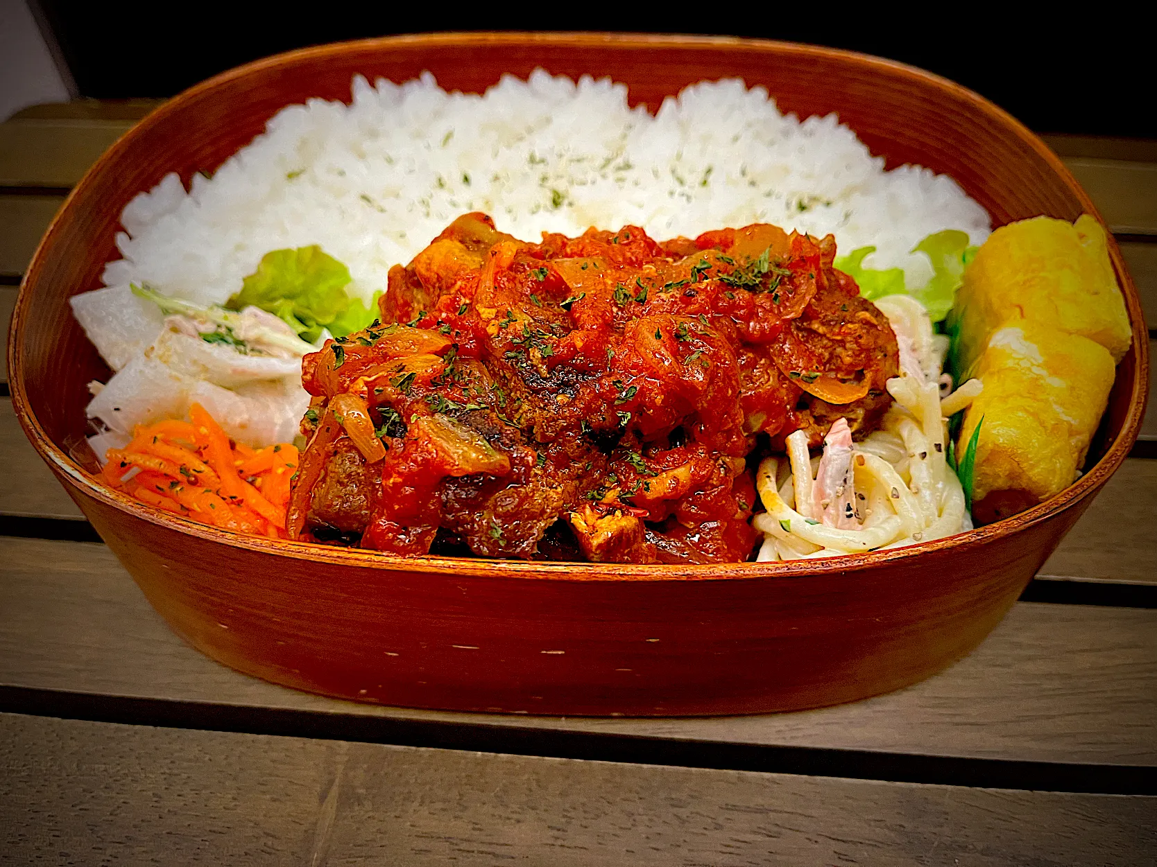 ハンバーグはトマトソースを絡めて