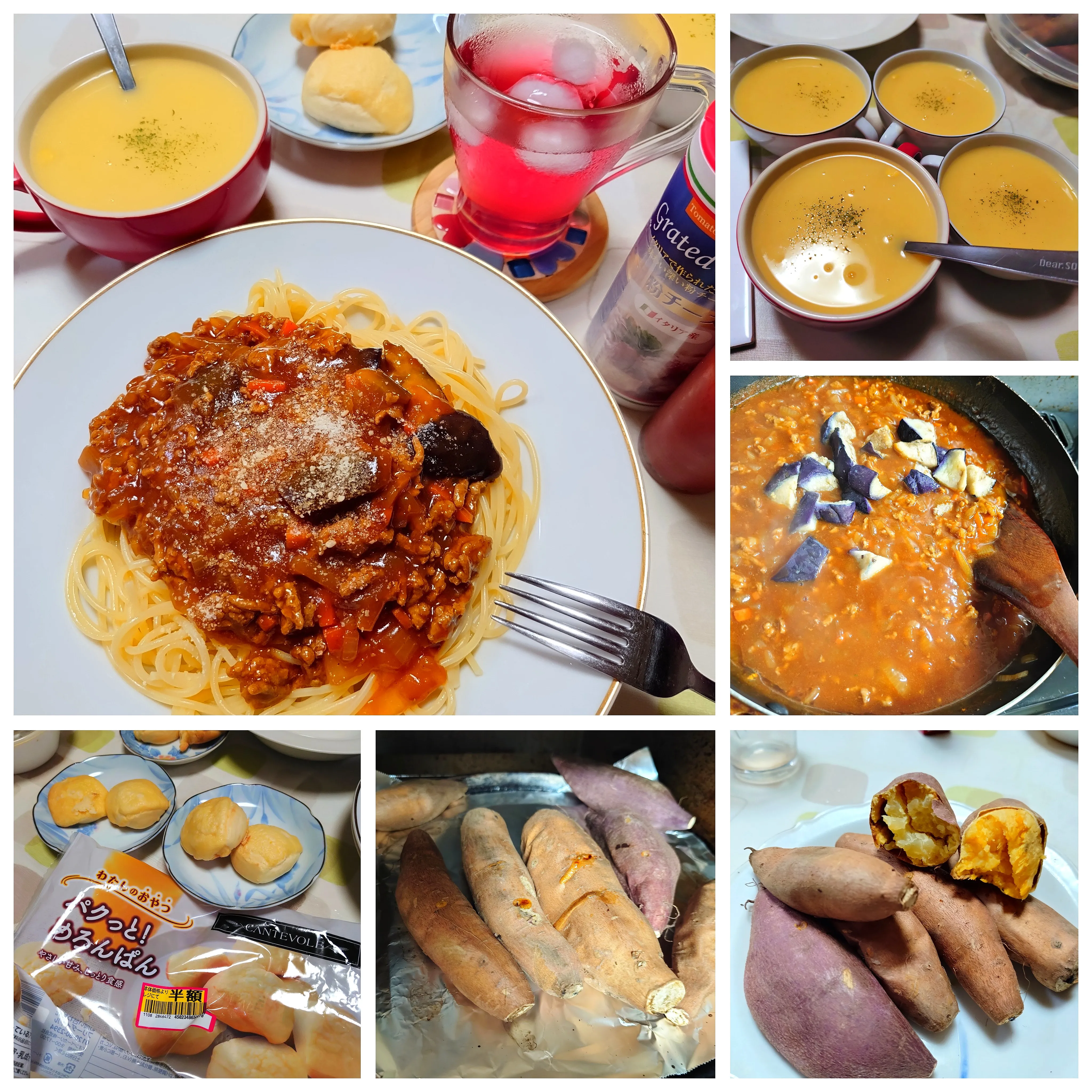 #メロンパン#ミートソース#冷凍パン#さつまいも#パクっとめろんぱん#コーンスープ#スパゲッティ