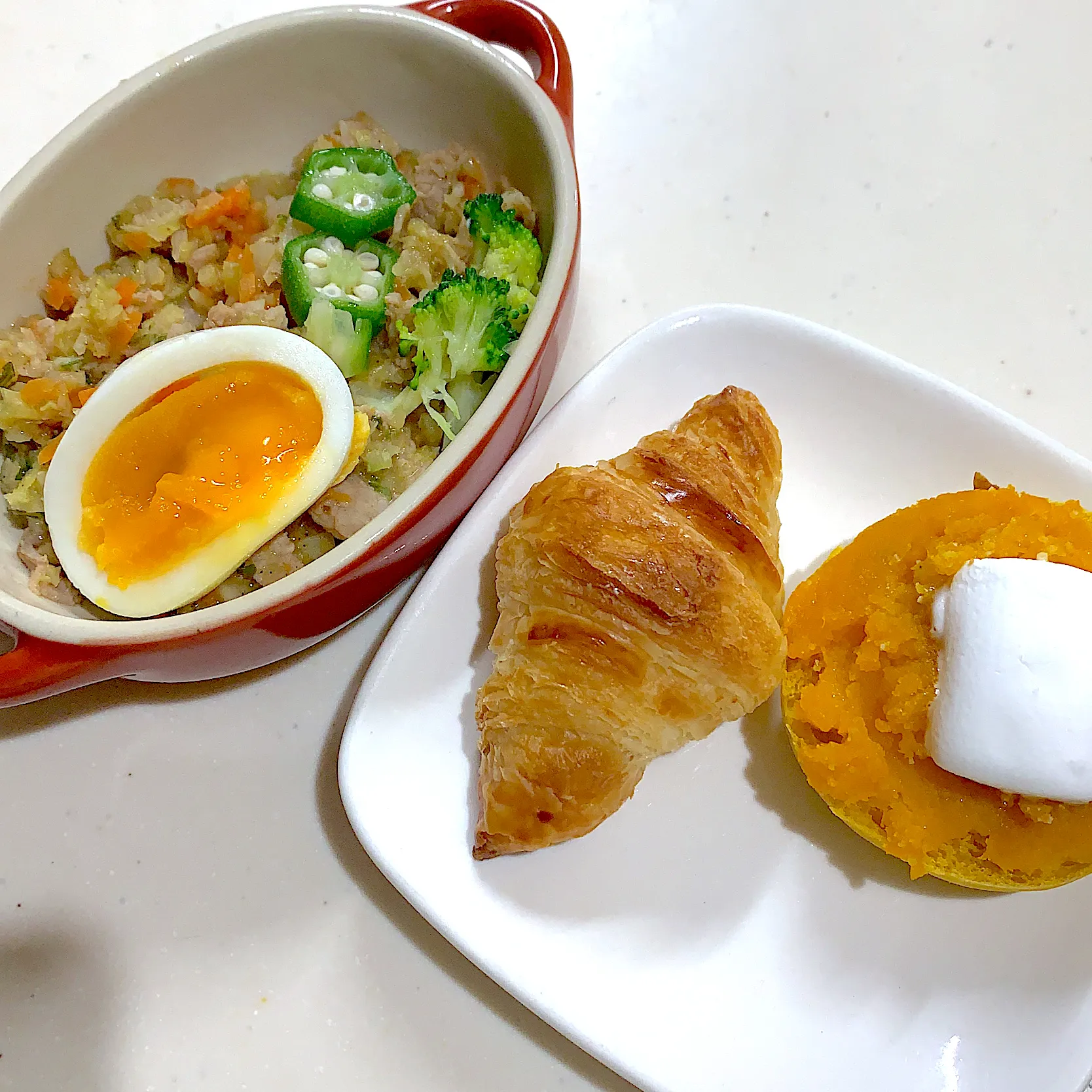 かぼちゃパン半分にパルメザンチーズ混ぜかぼちゃ盛り