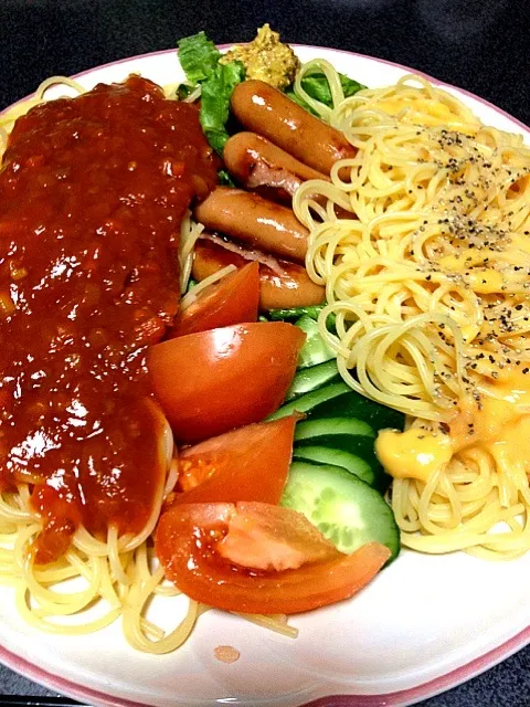 #夕飯 全部のせスパゲティ(ミートソース、トマト、キュウリ、レタス、ウインナー、つぶつぶマスタード、カルボナーラ)。基本ぜんぶ味が合う!