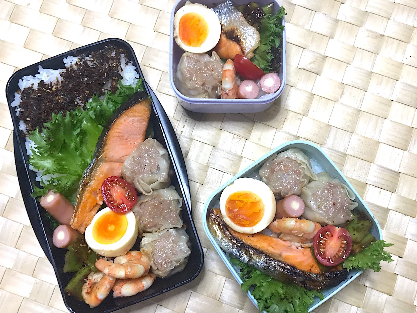 • 火曜日の高2の次男と私のお弁当。 豚肉のネギ塩、じゃがいもとウインナーのチーズ焼き、鯖の塩焼き、だし巻き卵、ブロッコリーの胡麻和え、プチ🍅|suzzyさん