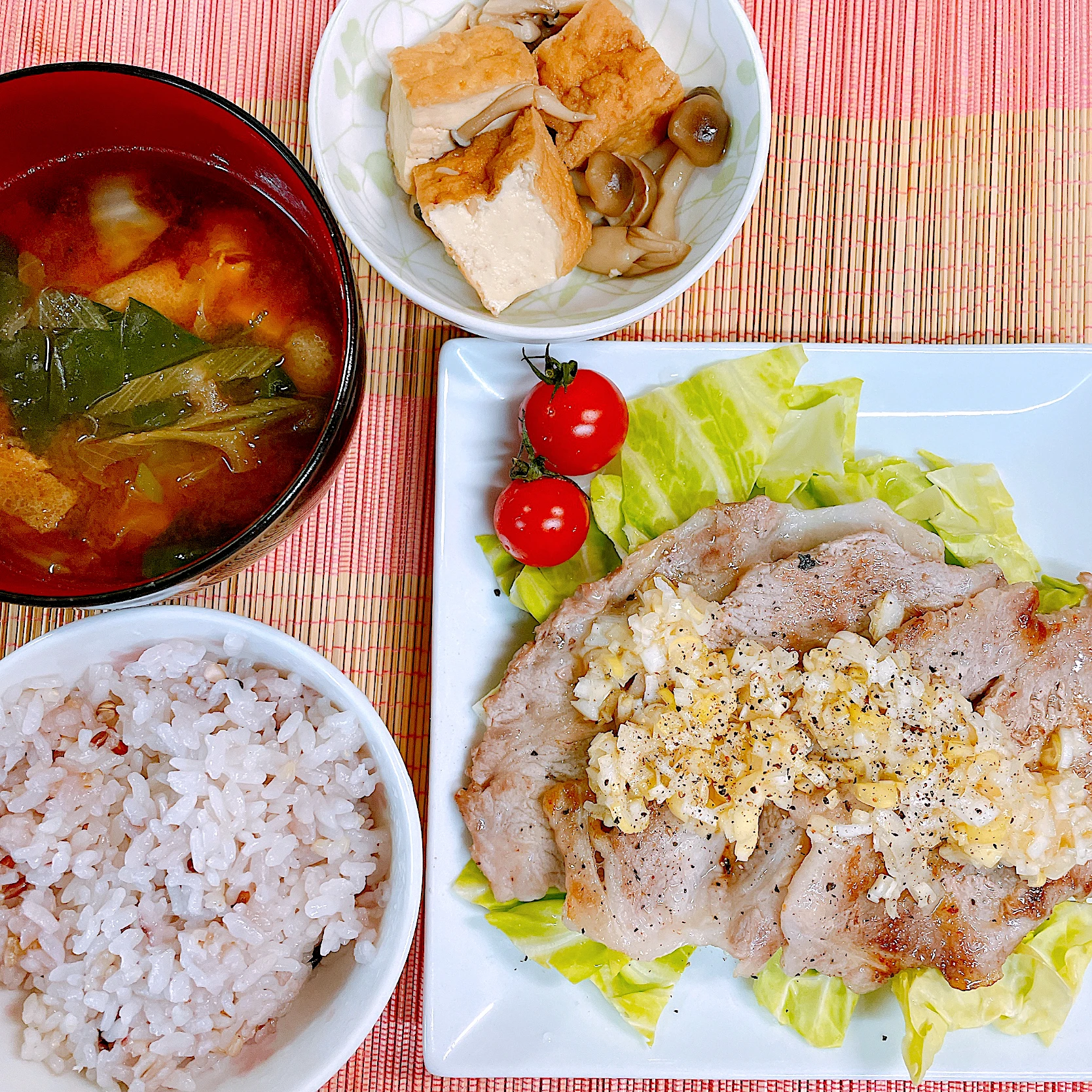 豚肉のねぎ塩だれがけ♡厚揚げとしめじの煮物♡お味噌汁♡