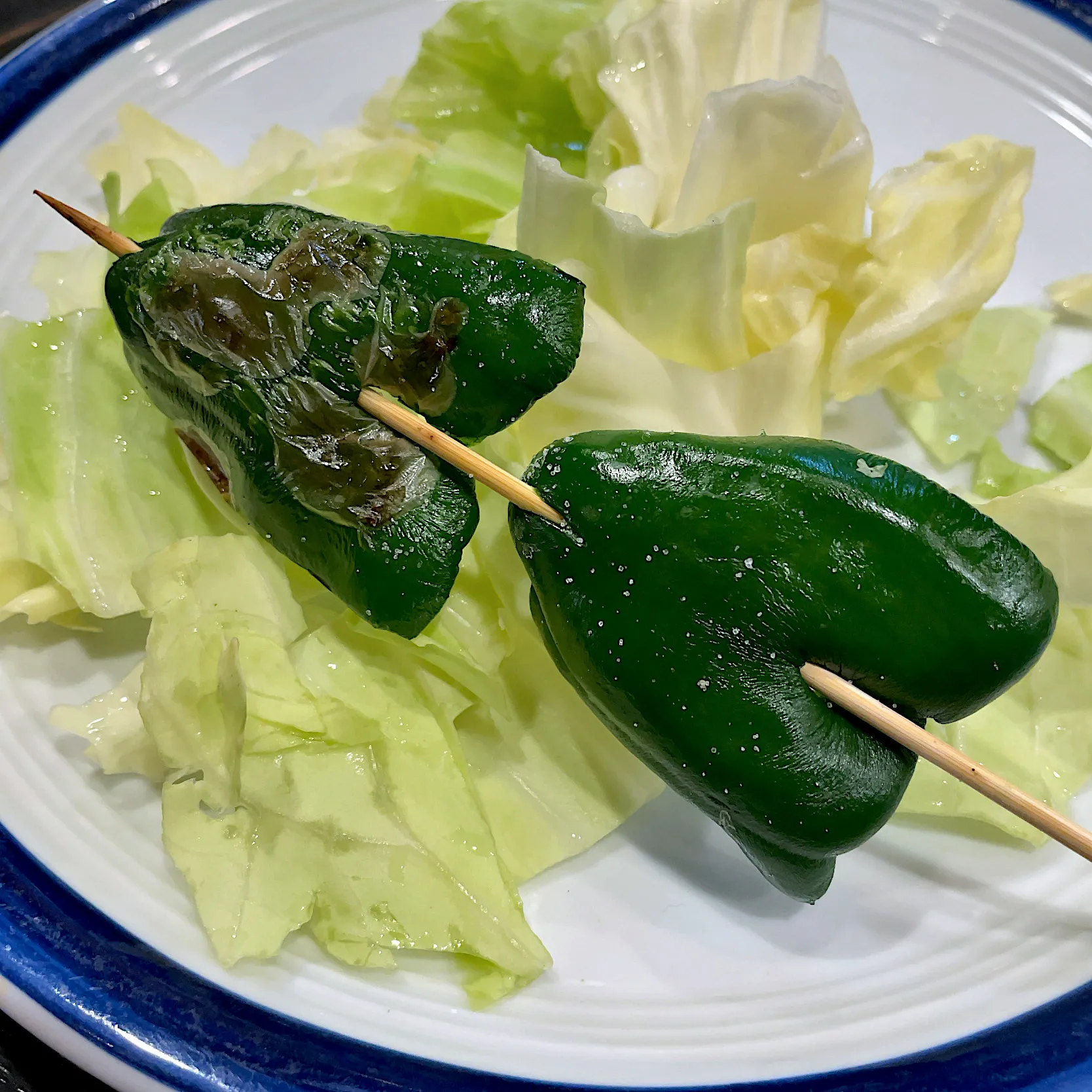 ここは焼鳥屋なので焼鳥もオーダーしなくちゃね。まずは、ピーマンの焼鳥が到着🫑 #おつまみ #焼き鳥 #福岡の料理