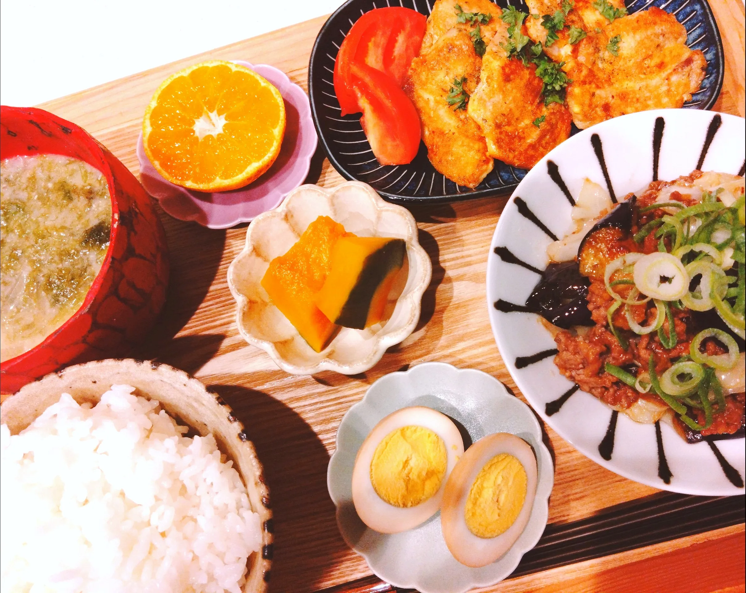 回鍋肉、白身魚のチーズピカタ、南瓜の煮付け、味付け玉子、お味噌汁、早生みかん|samさん