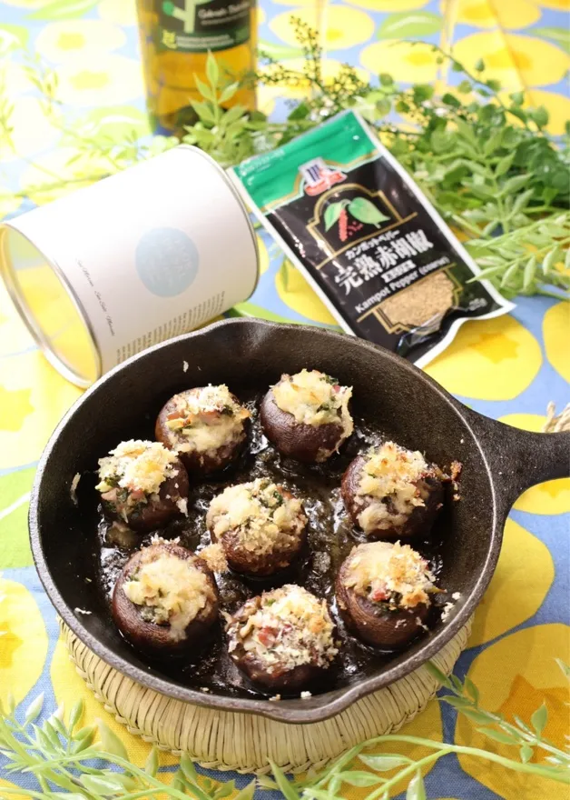 マッシュルームにマヨルカ島の塩と完熟赤胡椒をふり、軸を取り除いた穴に、ニンニク・生ハム・パセリを詰める。