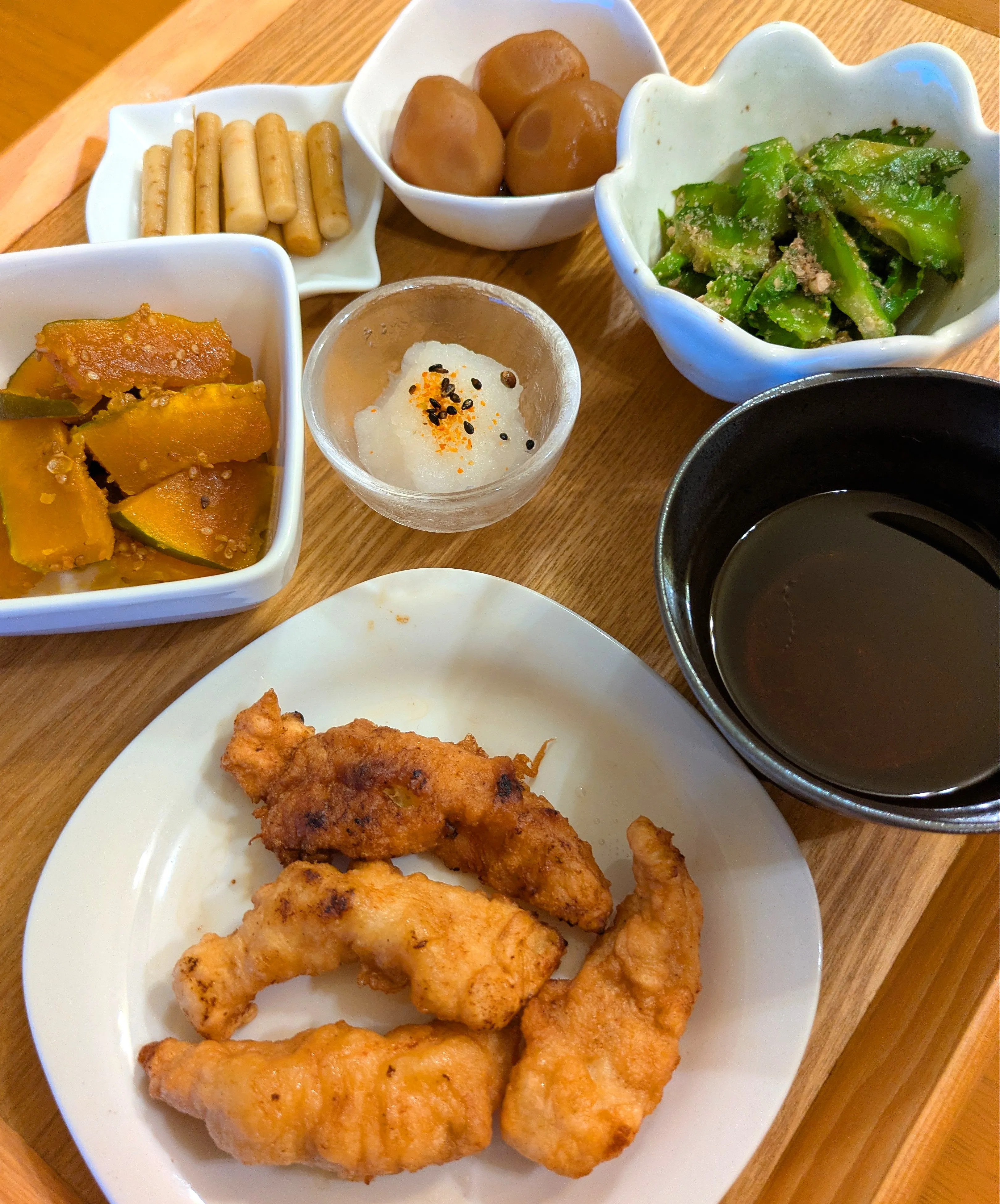 #夕食#とり天#きんぴら#ごま和え#味付け玉コンニャク#ゴボウ漬