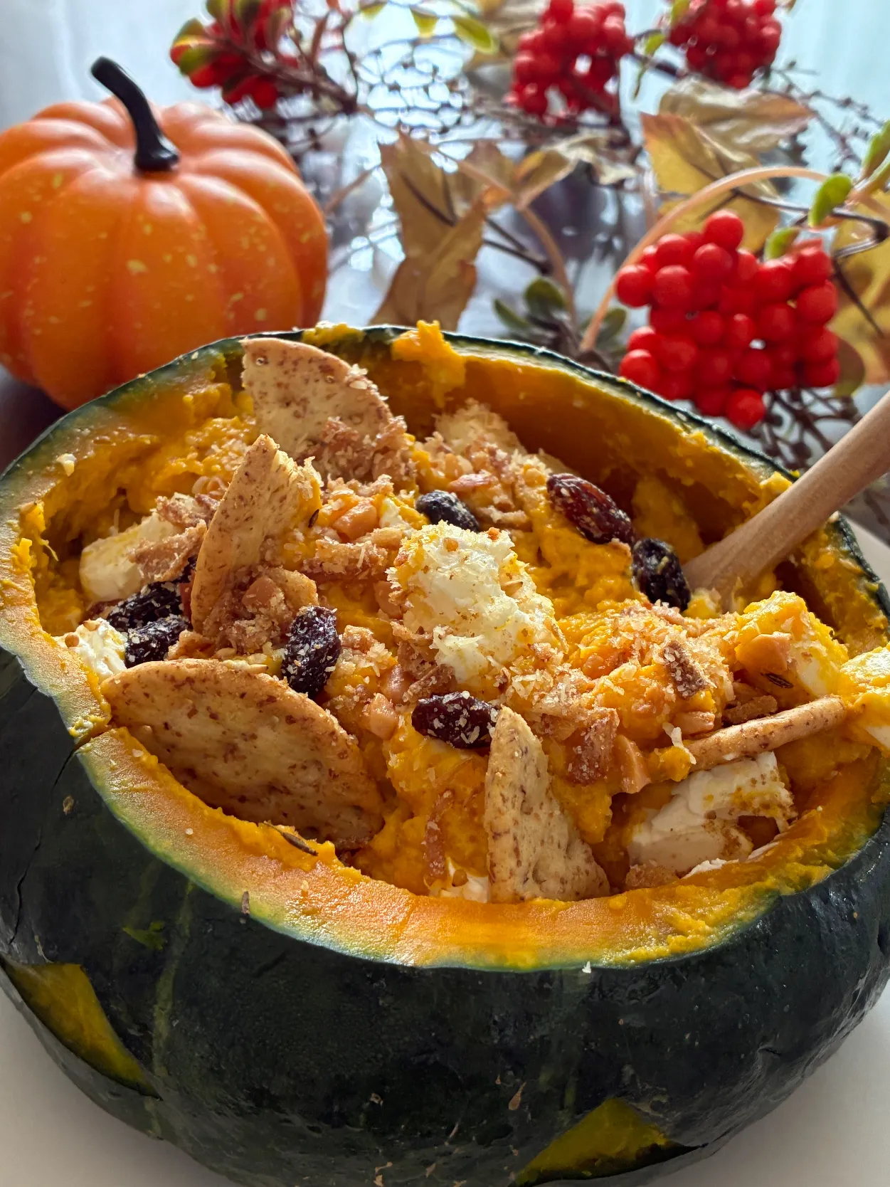 かぼちゃをくり抜いて器にした、かぼちゃサラダを作りました✨