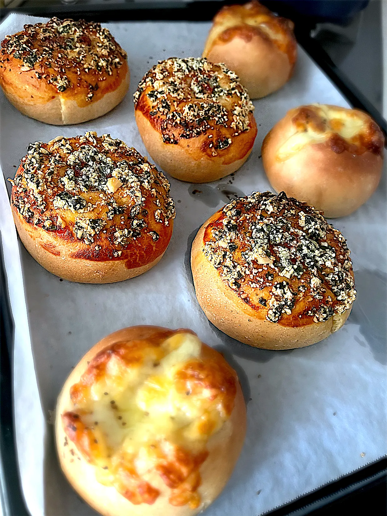#はったい粉 入りの生地で、いつもの #カマンベール 入り #チーズパン と #粉チーズ #マカデミアナッツ の #バジルパン #BRUNCH #branch #美味しい #ふわふわ #焼きたて たまりません😋