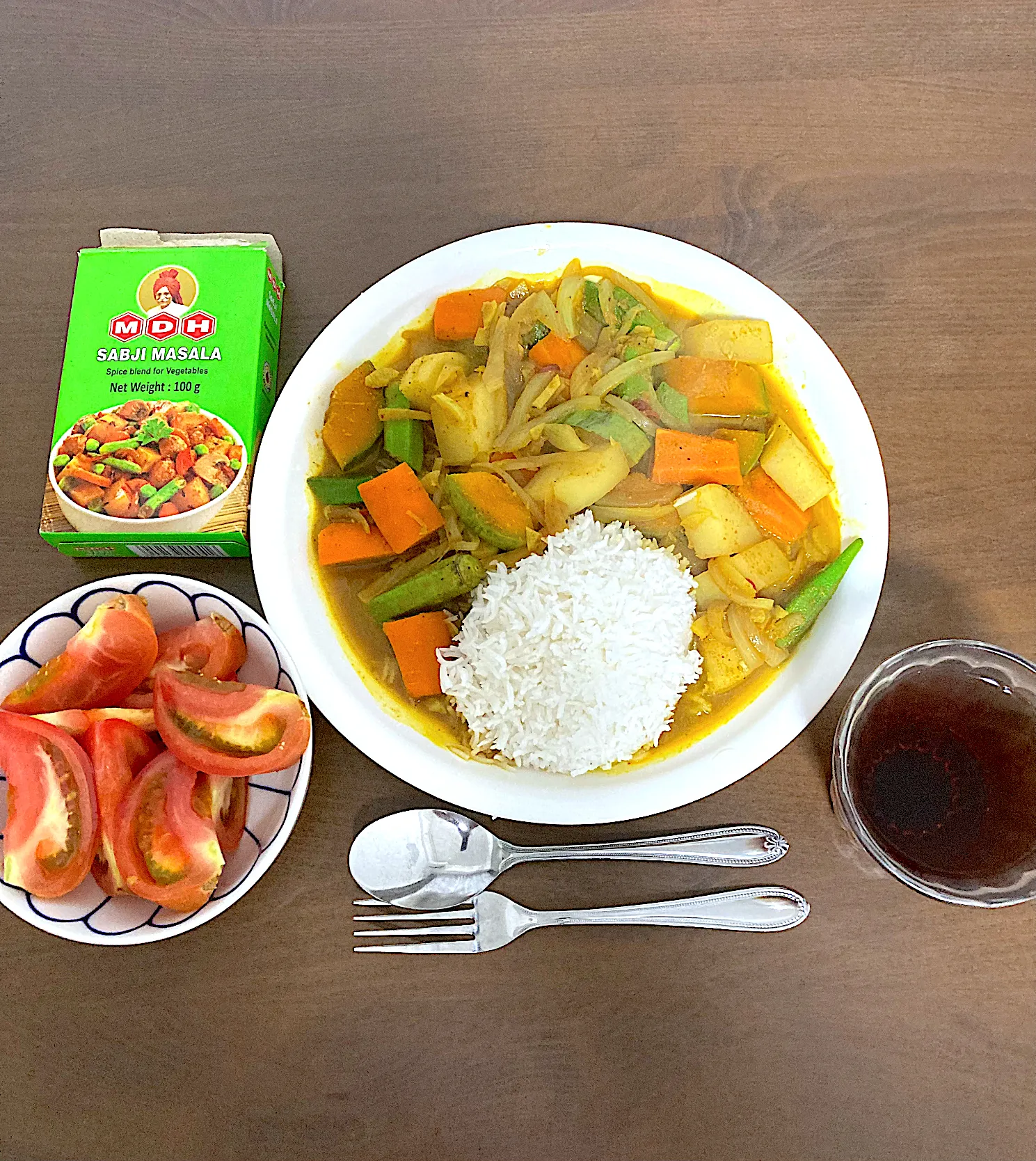 サブジマサラ 細かく刻んだ玉ねぎ、にんにく、生姜、赤唐辛子にMDHのサブジマサラを振りかけて炒め、人参、大根、かぼちゃ、獅子唐を投入して軽く煮込んで作りました。人参とかぼちゃは電子レンジにかけて柔らかくしてから投入。冷蔵庫の中の野菜一掃メニュー。
