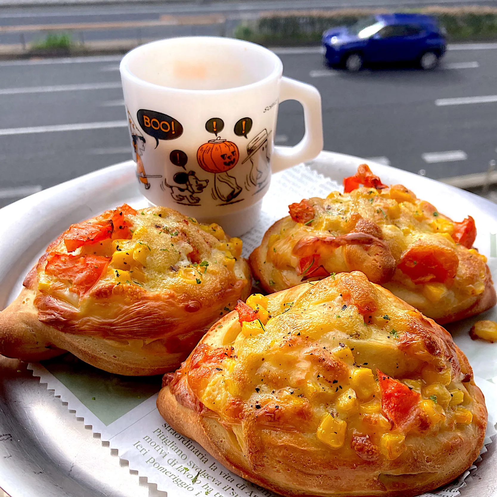 そこにマヨネーズで和えたコーンとトマト、チーズをのせて焼成。