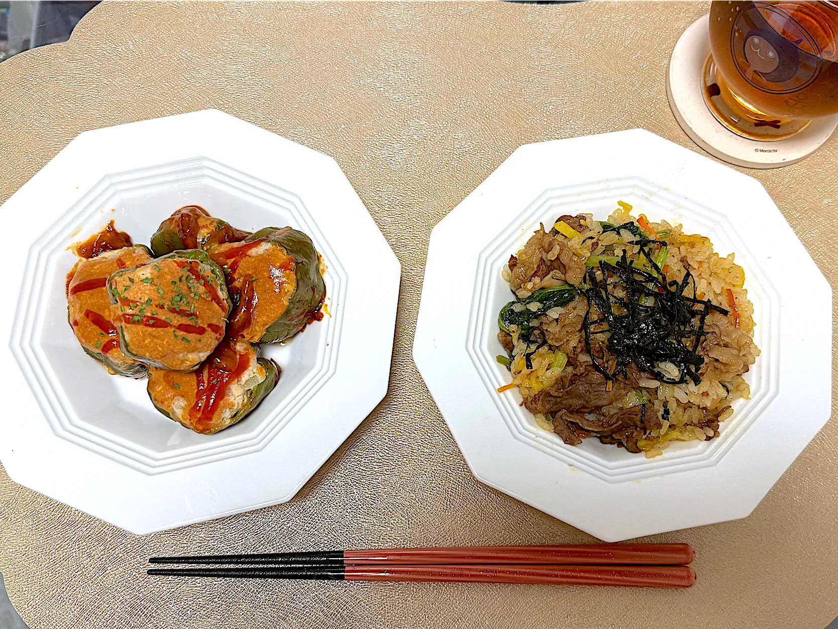 オーロラソースのピーマンの肉詰め🫑と韓国風チャーハン🇰🇷