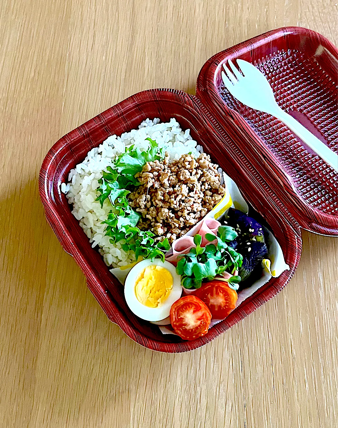 副菜はゆで卵、かいわれを巻いたハム、ナスのレンチン甘酢和え、そしてミニトマト🍅