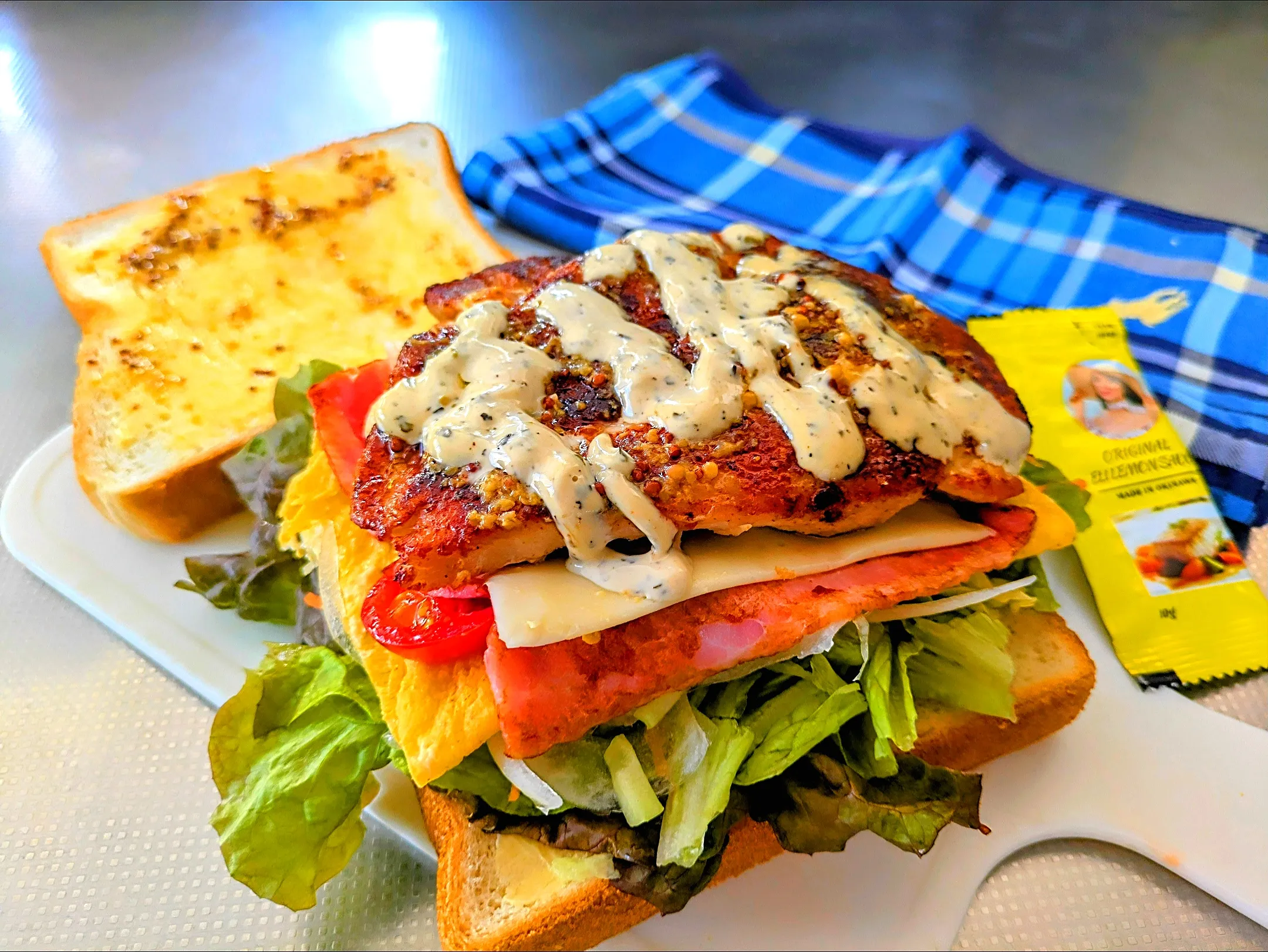 厚さが薄いベーコン【Bacon】とサニーレタス【Lettuce】とプチトマト【Tomato】ではもの足りず、皮面をカリカリに焼いた鶏もも肉のチキンロースト【Chicken】に沖縄地元ソースの #エリソース レモン、とろけるスライスチーズ【Cheese】、薄焼きたまご【Egg】、野菜はサニーレタスに一部つくりおきサラダを代用
