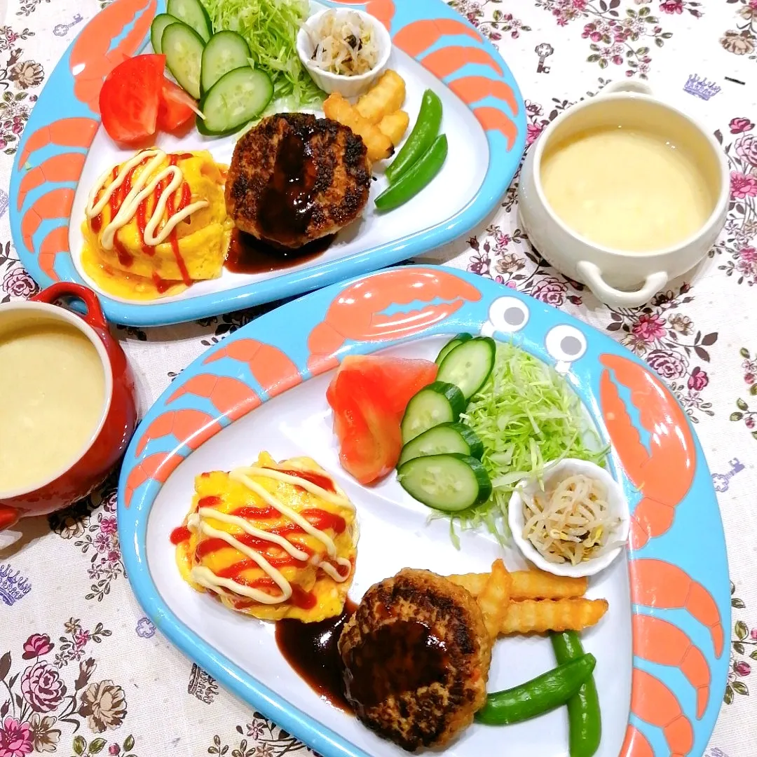 簡単なハンバーグにオムライス、サラダ、コーンスープなんだけどね😅‼