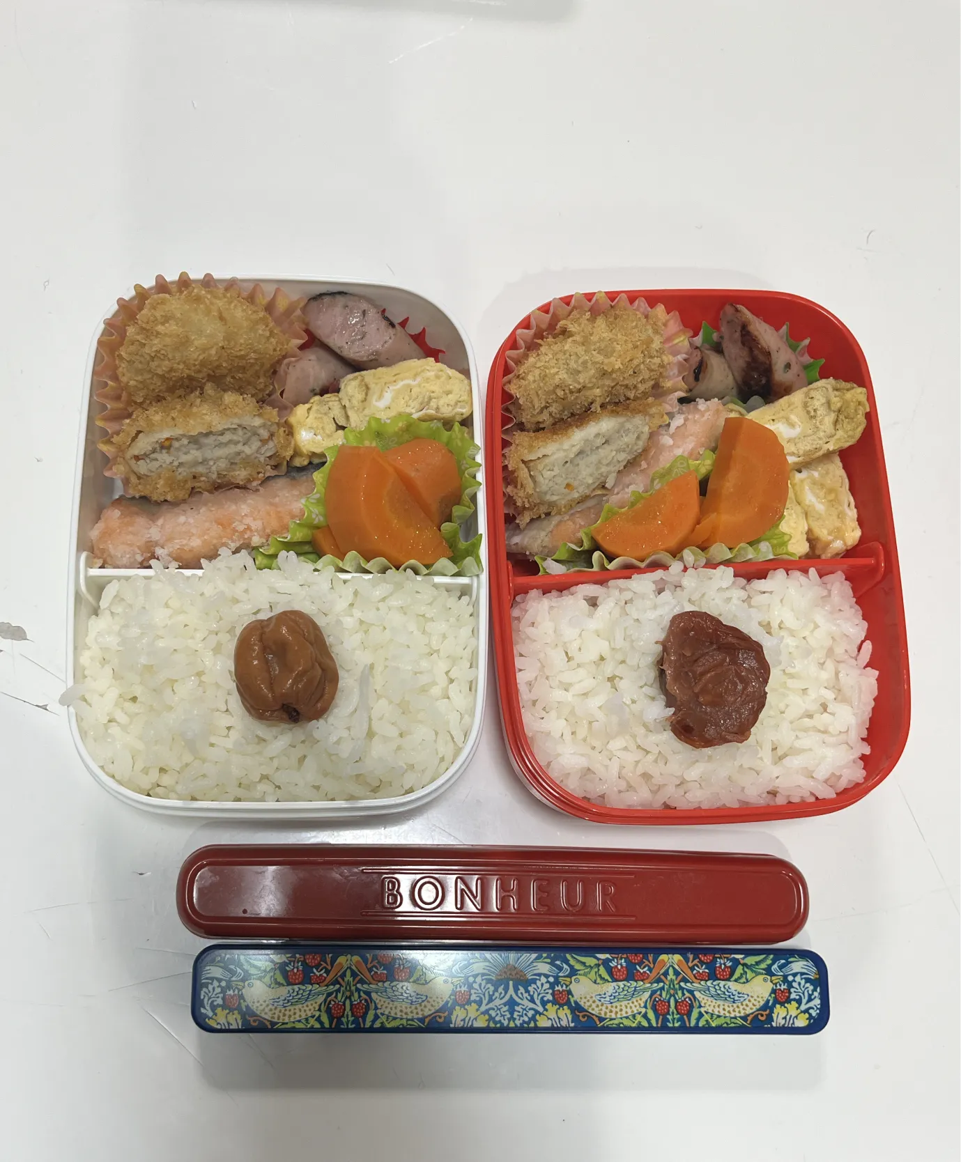 パパ弁と母弁☆人参のグラッセ☆卵焼き☆レモンとバジルのソーセージ☆いわしとごぼうのフライ☆秋鮭のフライ|Saharaさん