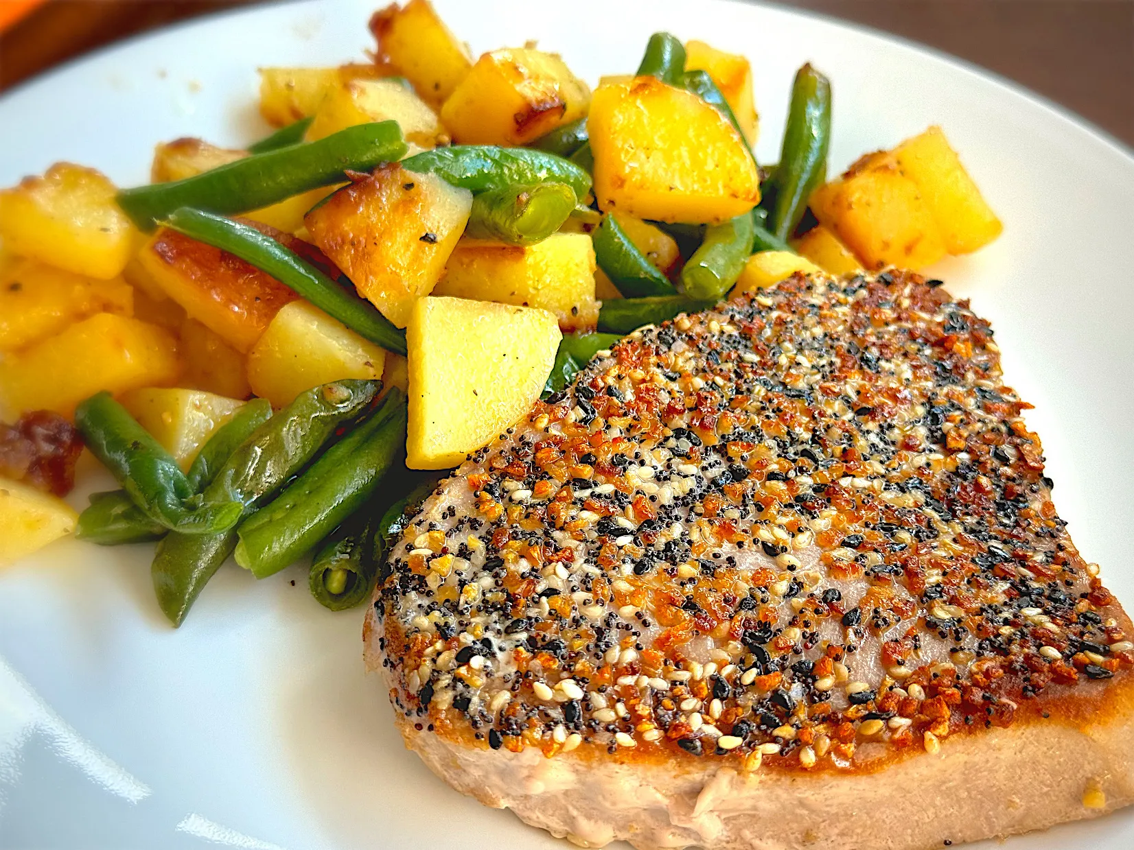 Pepper-Crusted Tuna Steak with Roasted Potatoes and Green Beans