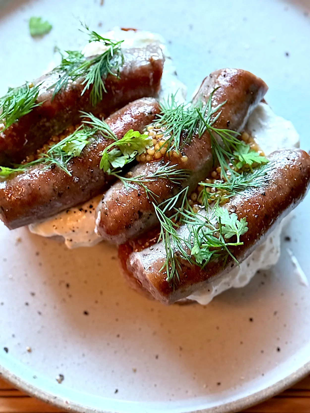 #オープントースト #オープンサンド #ホットドッグ #羊肉 #ソーセージ #生ソーセージ #サルシッチャ #ストラッチャテッラ #粒マスタード #家庭料理 #モダン料理 #モダンアメリカ料理 #おうちイタリアン #onekilnceramics #onekiln