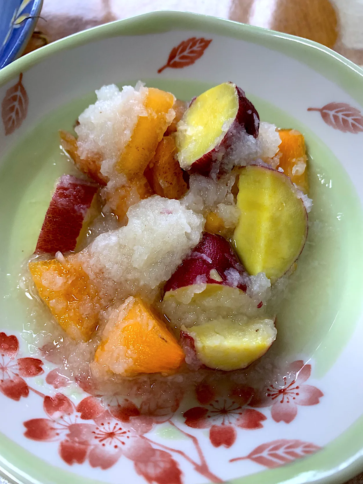 大根おろしにかんたん酢を混ぜただけ。果物とさつま芋の甘さがあるので、砂糖を控えて酢と塩でもいいです。