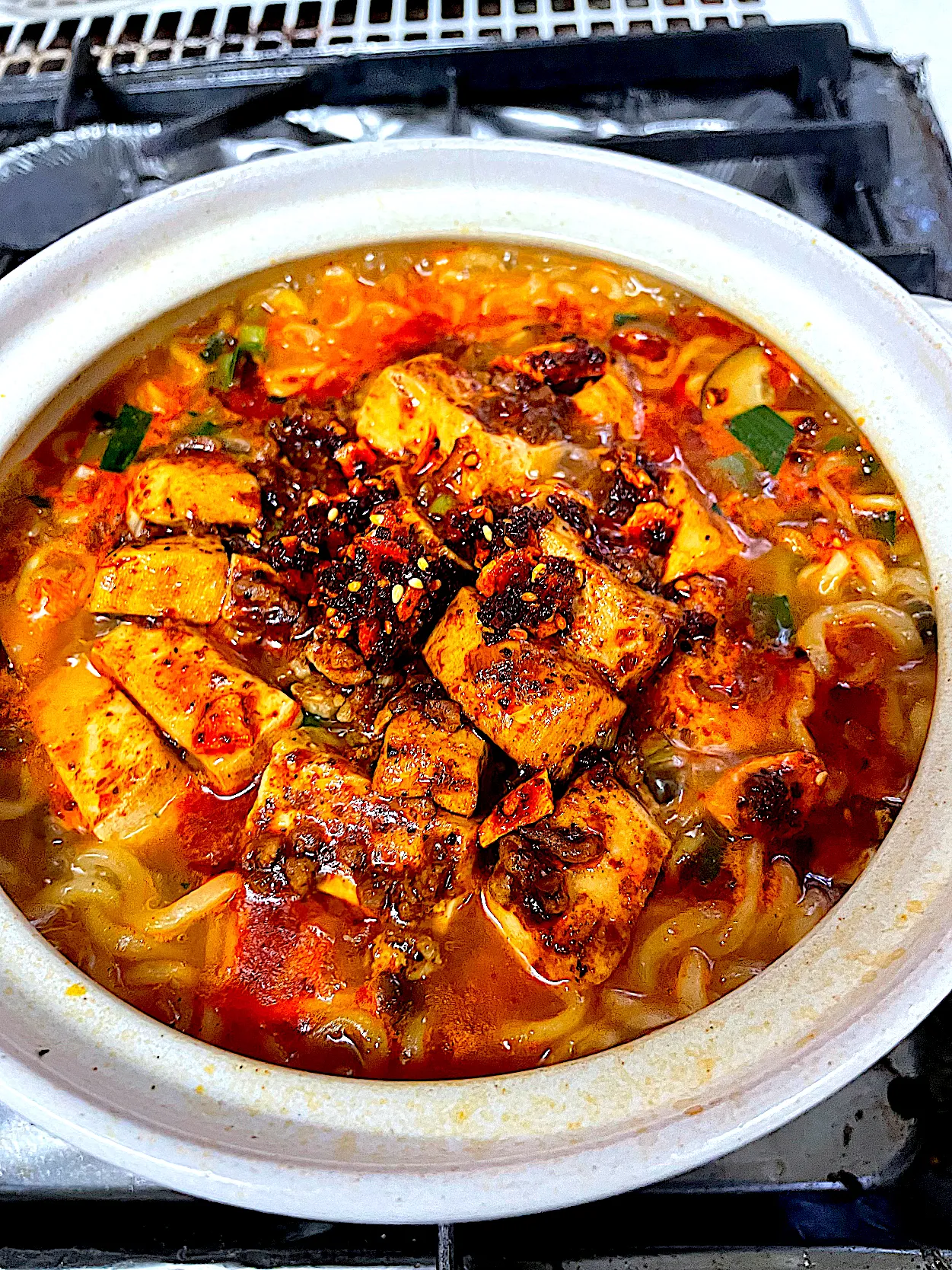 三養メップ黒胡椒牛肉味ラーメンと味の素Cook Do極 麻辣麻婆豆腐で鍋焼き麻婆麺@自宅