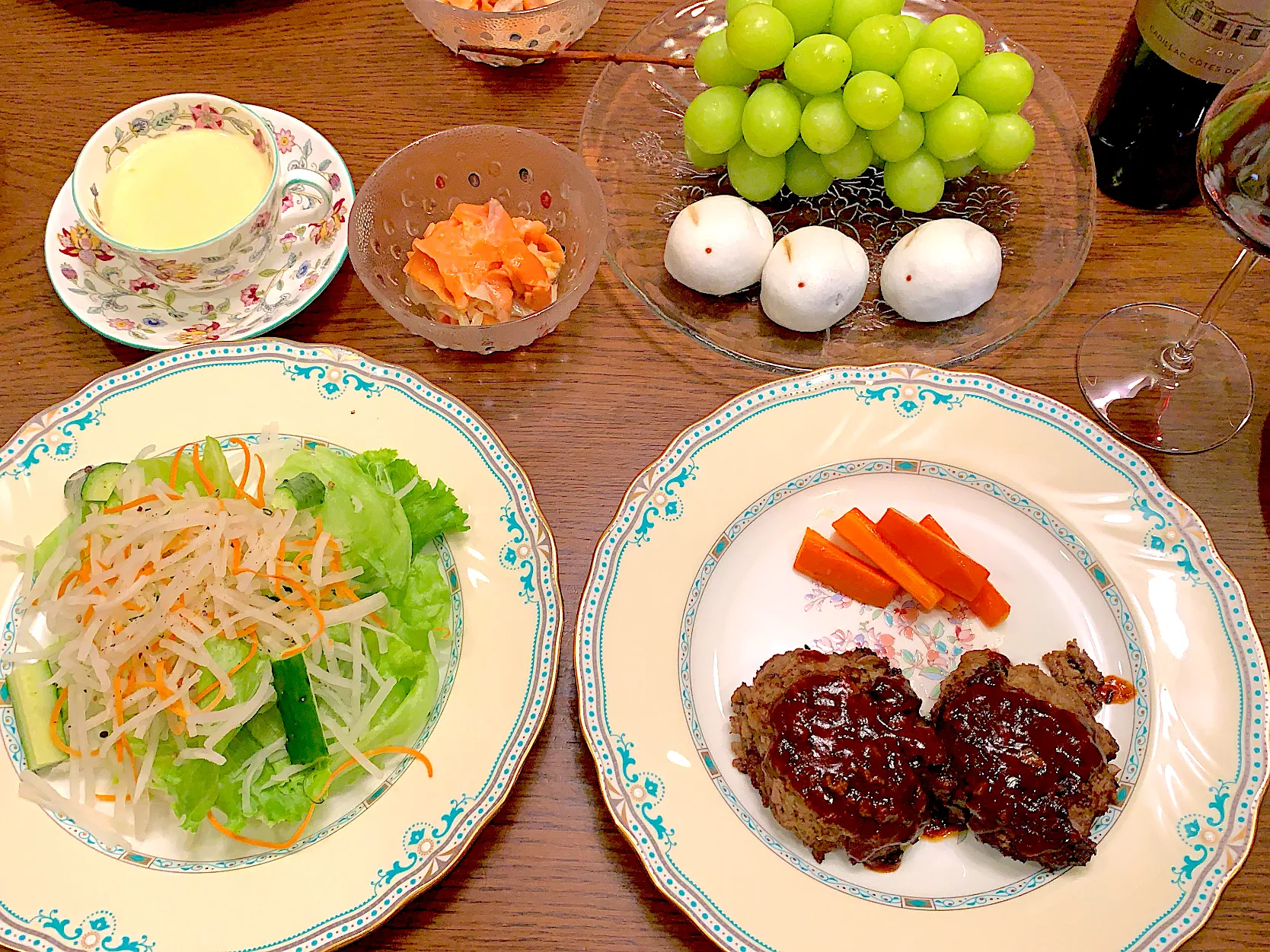 ハンバーグ・サラダ・サーモンのマリネ・コーンスープ・シャインマスカット・上用饅頭
