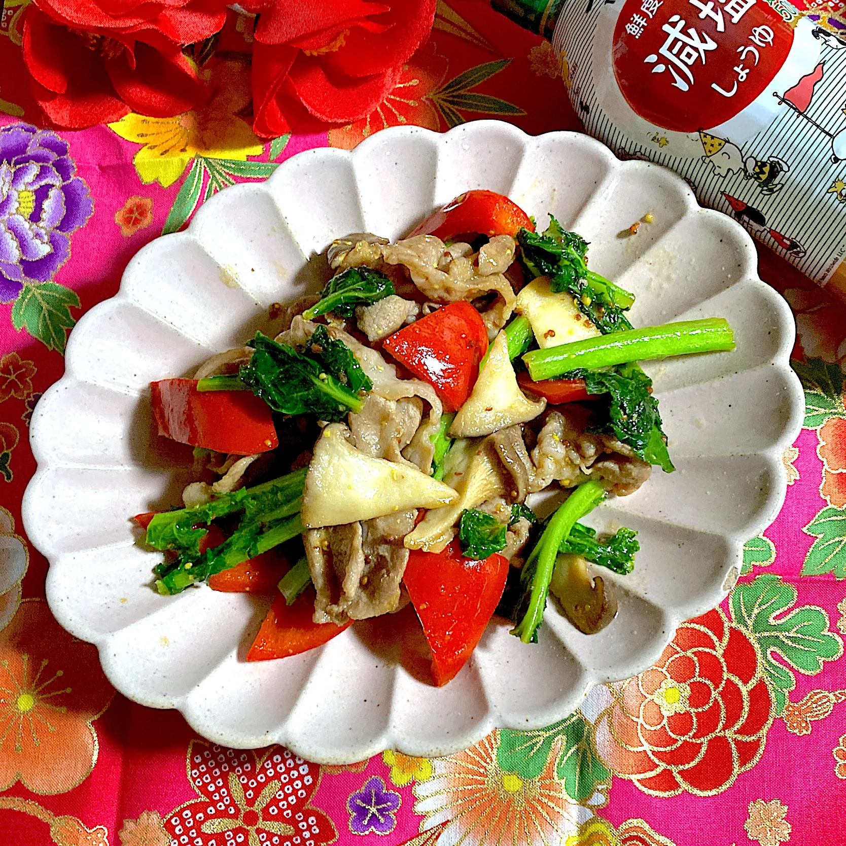 好きな菜の花に豚肉とキノコで粒マスタード使いの炒め物しました😄