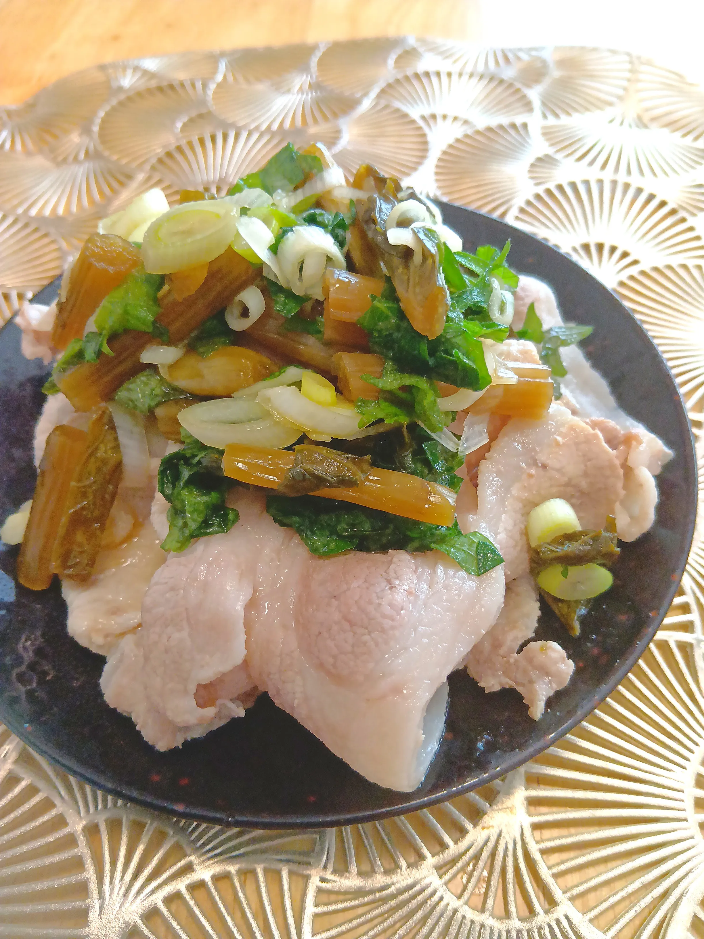 義理の母手作りの野沢菜漬け、大葉、ネギをたっぷり乗せて🤤味付けはポン酢とこんぶ茶で🎵