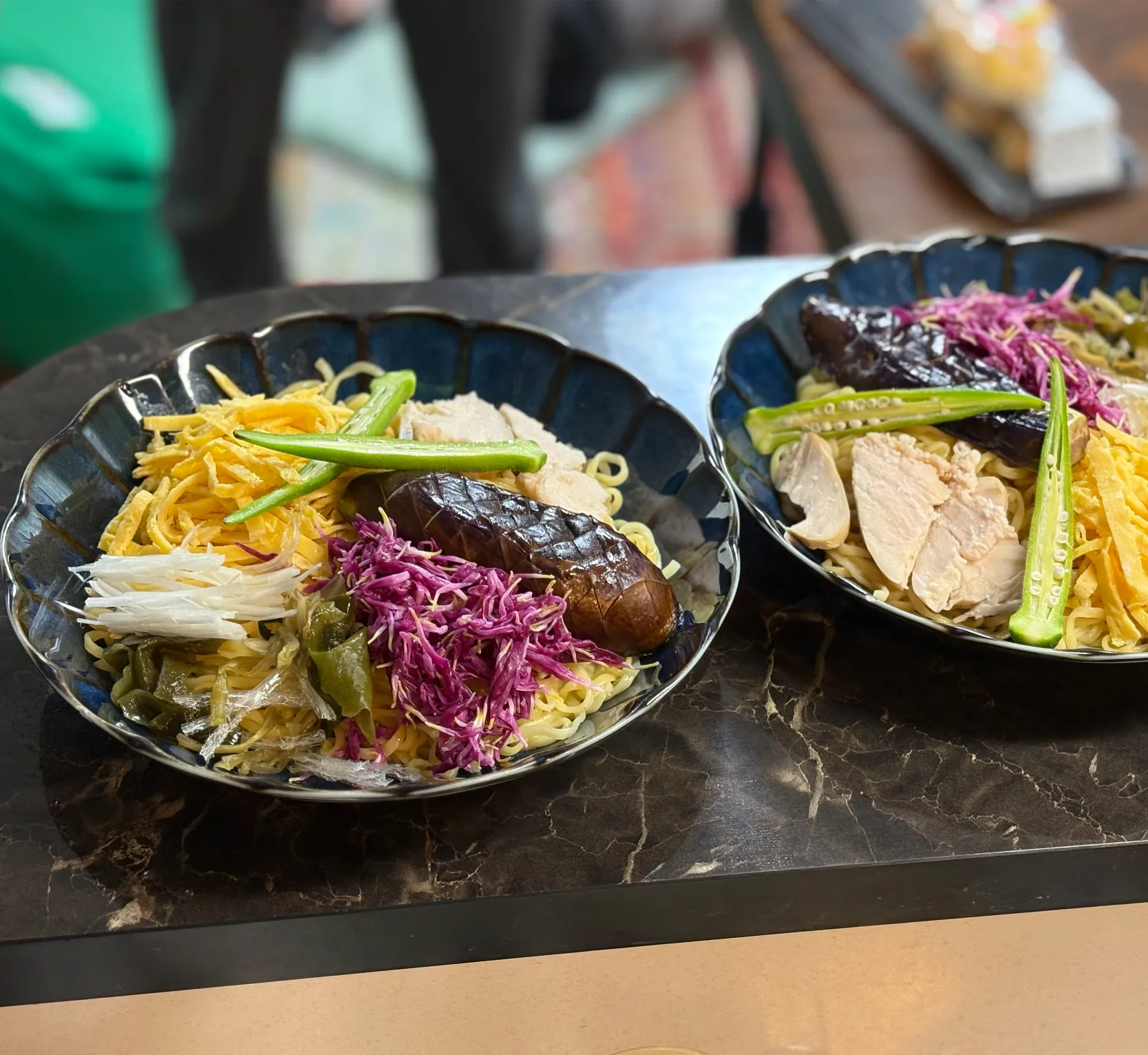#冷やし中華 #中華三昧 #かきのもと #オクラ #錦糸卵 #茹で鶏 #焼きナス #白髪ネギ