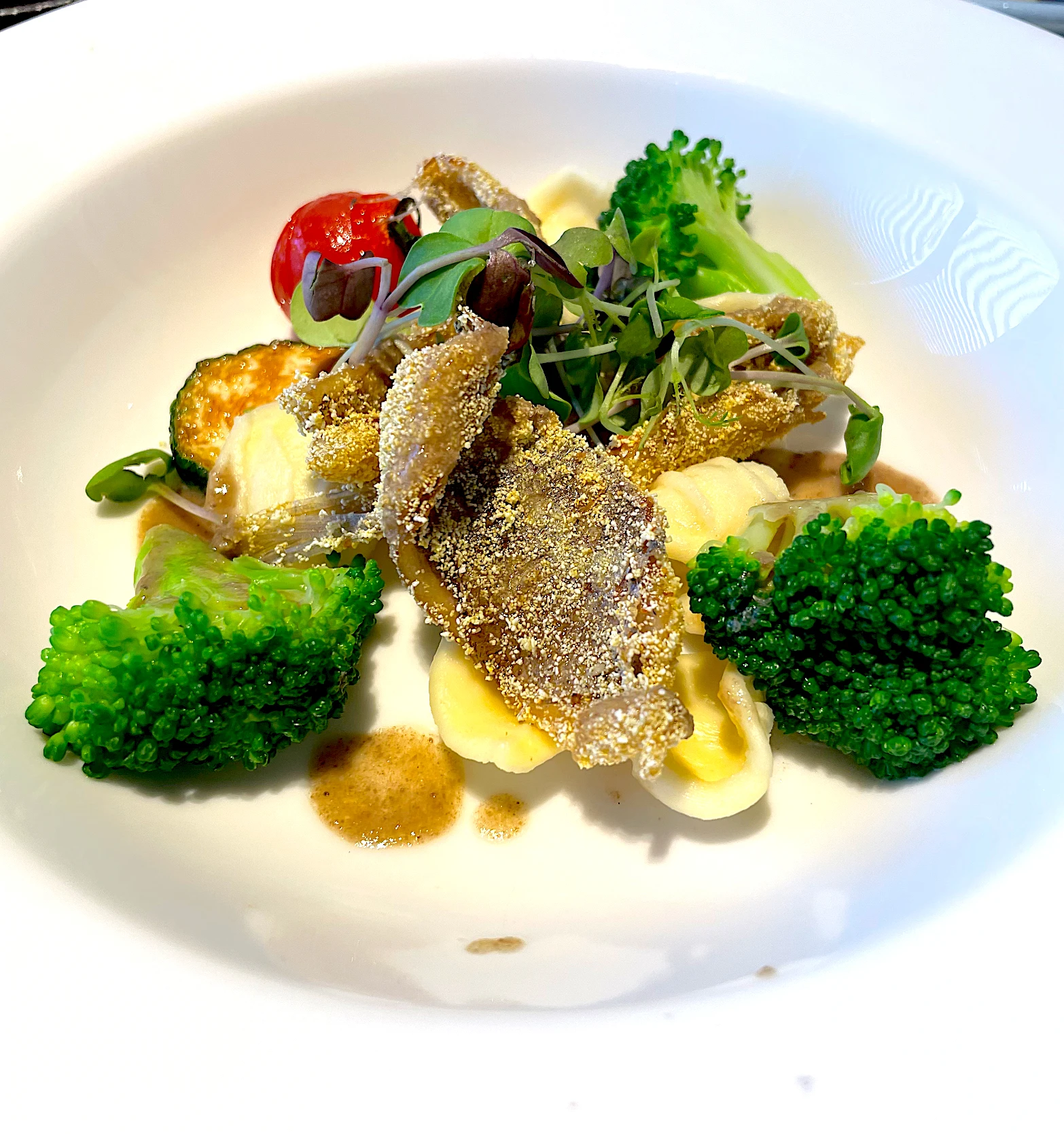 三陸イシモチのポレンタあげ オレキエッテ、ブロッコリーとアンチョビサルサ