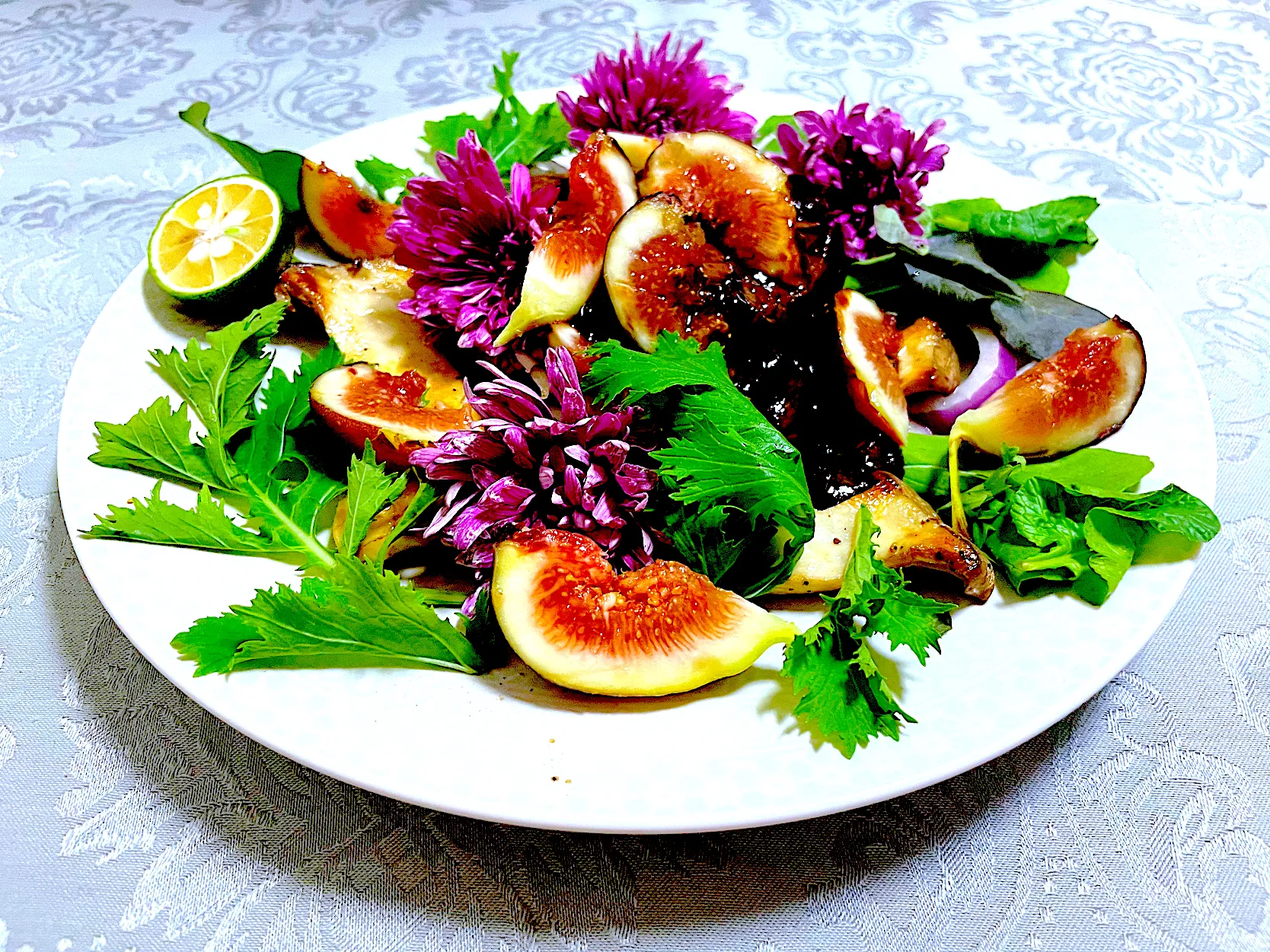 牛ステーキと無花果を合わせるのは、snap dishや他にいろんなところで目にしてたので、あとは、縦割りしたエリンギを香ばしくローストして、ベビーリーフでグリーンを足したり、紫の食用花を飾ったり、同系色のレッドオニオンのスライスなども合わせてみました。