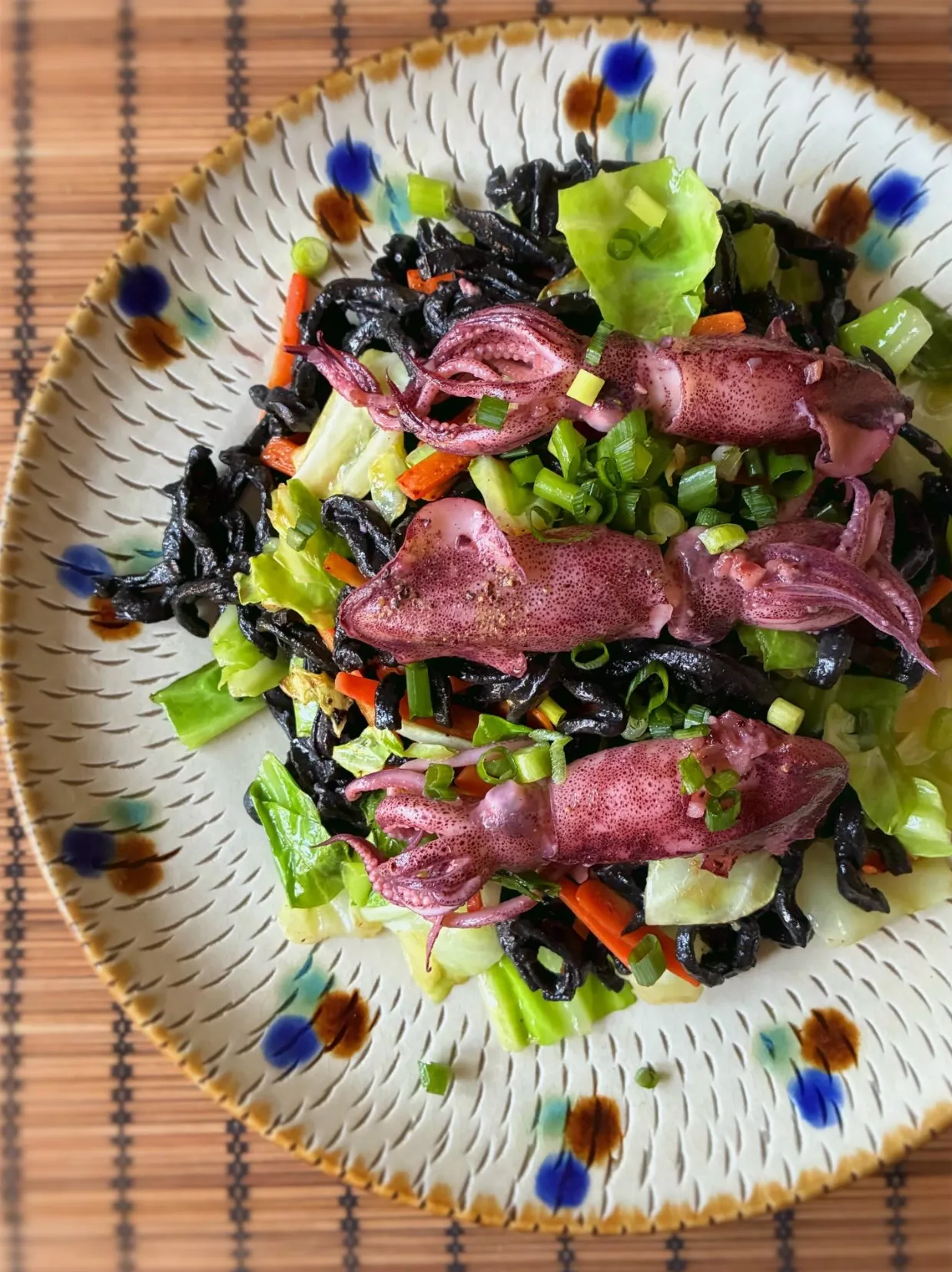 麺に練る事で他の具は墨で黒くならずに彩りが保たれたままで、ビジュいい感じに〜👍