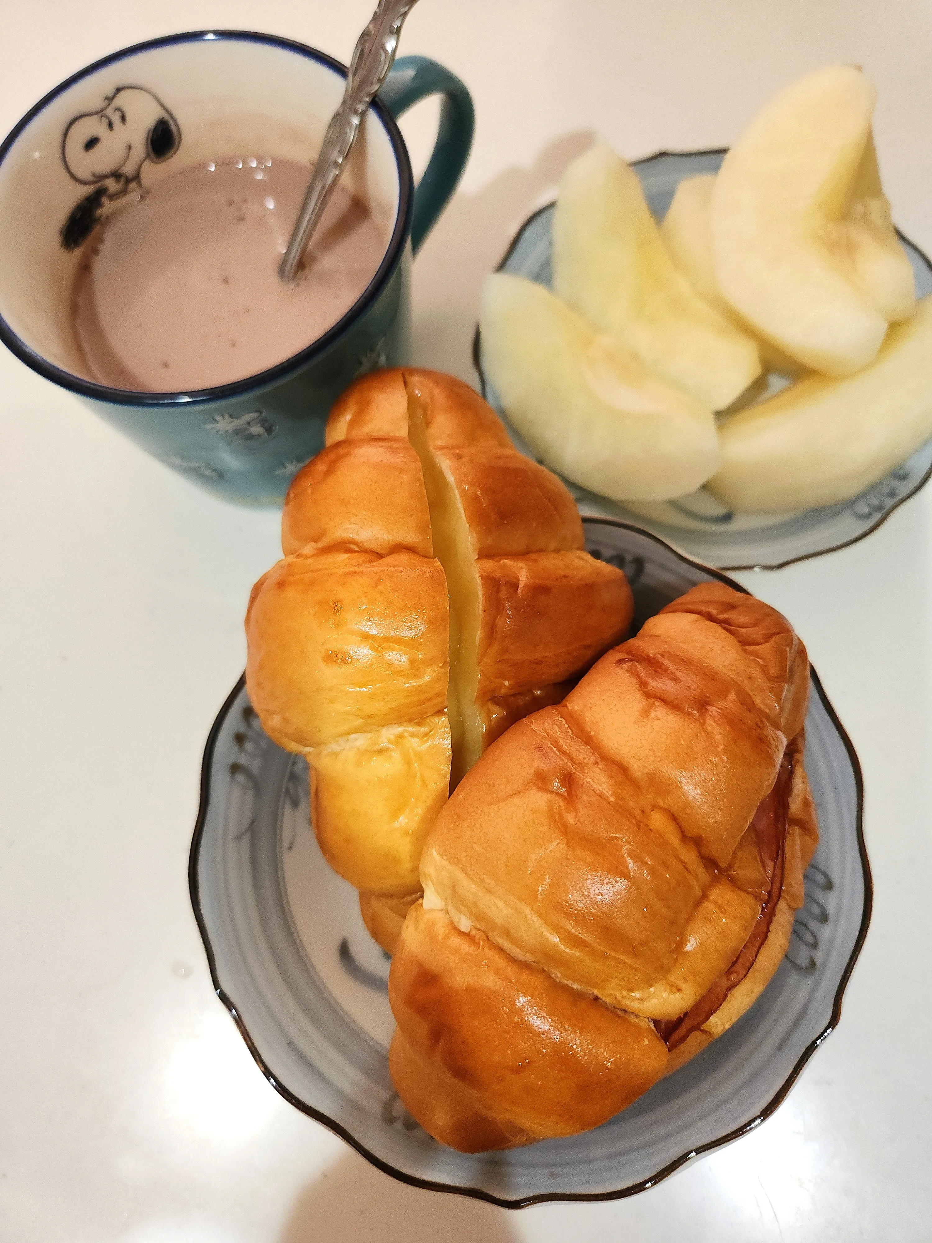 チーズパン、ハムパン、ココア、梨